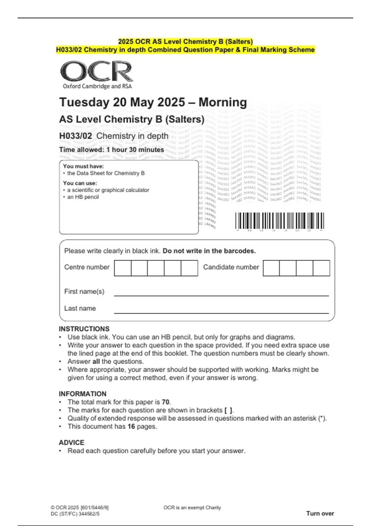 Exam (elaborations) 2025 OCR AS Level Chemistry B (Salters) H033/02 Chemistry in depth Combined Question Paper & Final Marking Scheme 2 Exam (elaborations) 2025 OCR A Level Chemistry B (Salters) H433/01 Fundamentals of Chemistry Combined Question Paper & Final Marking Scheme 3 Exam (elaborations) 2025 OCR A Level Chemistry B (Salters) H433/02 Sc