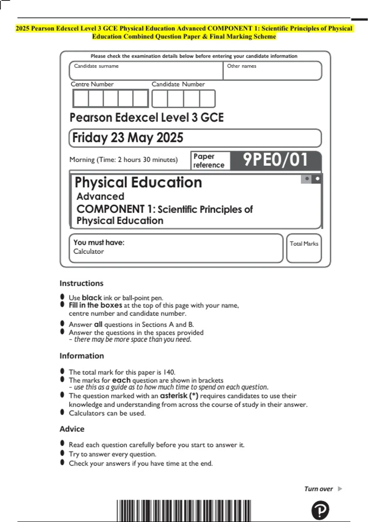 2025 Pearson Edexcel Level 3 GCE Physical Education Advanced COMPONENT 1: Scientific Principles of Physical Education Combined Question Paper & Final Marking Scheme 2 Exam (elaborations) 2025 Pearson Edexcel Level 3 GCE Physical Education Advanced COMPONENT 2: Psychological and Social Principles of Physical Education Combined Question Paper & Fina