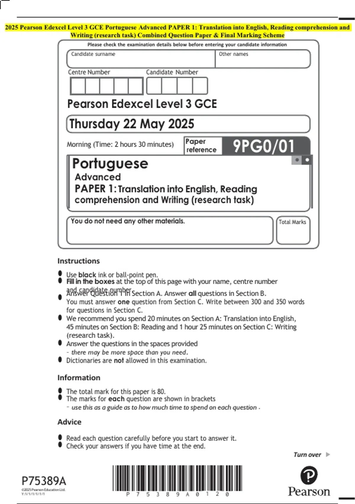 2025 Pearson Edexcel Level 3 GCE Portuguese Advanced PAPER 1: Translation into English, Reading comprehension and Writing (research task) Combined Question Paper & Final Marking Scheme 2 Exam (elaborations) 2025 Pearson Edexcel Level 3 GCE Portuguese Advanced PAPER 2: Translation into Portuguese and Written response to works Combined Question Pape