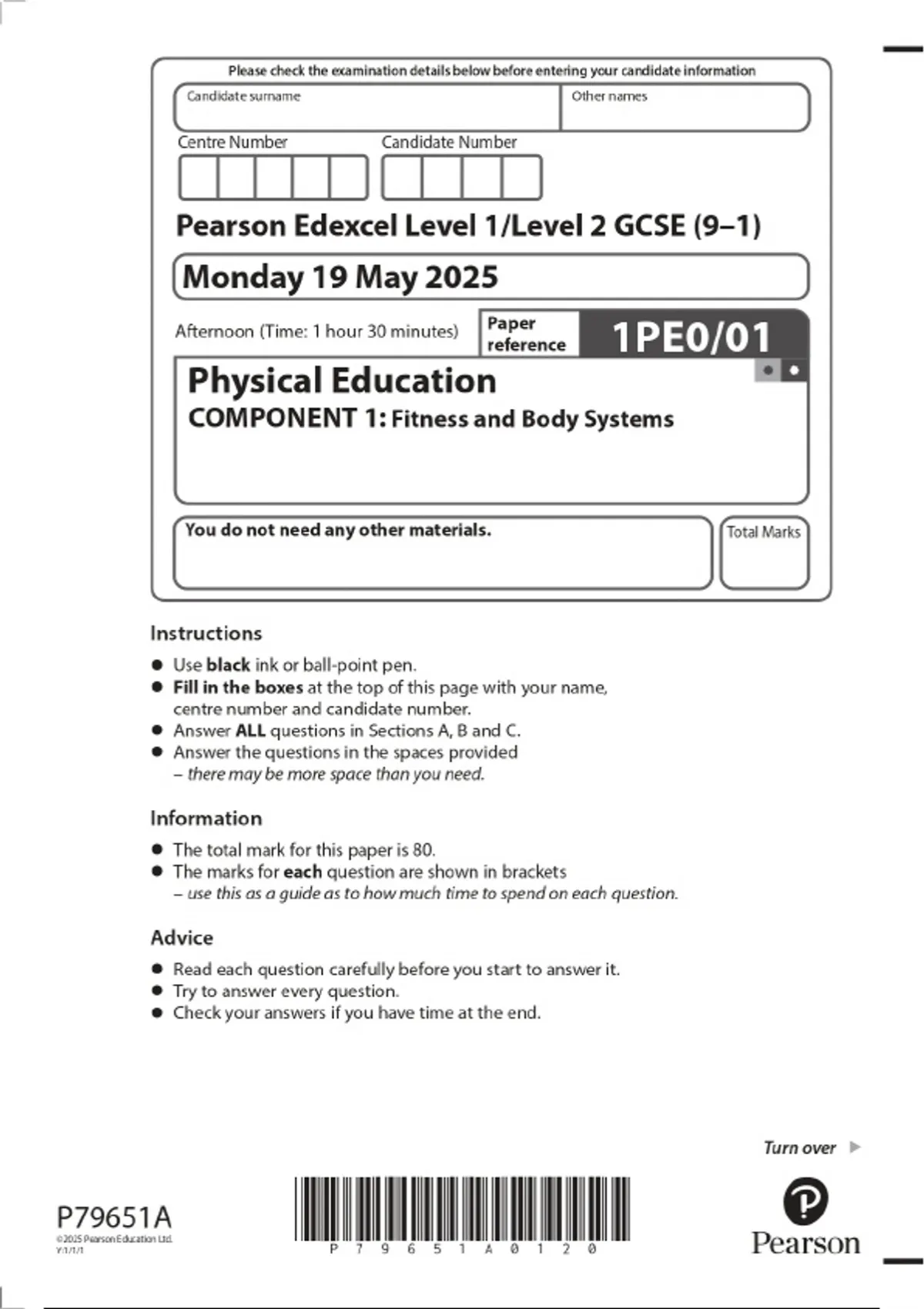 2025 Pearson Edexcel Level 1/Level 2 GCSE (9–1) Physical Education COMPONENT 1: Fitness and Body Systems Combined Question Paper & Marking Scheme 2 Exam (elaborations) 2025 Pearson Edexcel Level 1/Level 2 GCSE (9–1) Physical Education COMPONENT 2: Health and Performance Combined Question Paper & Marking Scheme 3 Exam (elaborations) 2025 Pearson E
