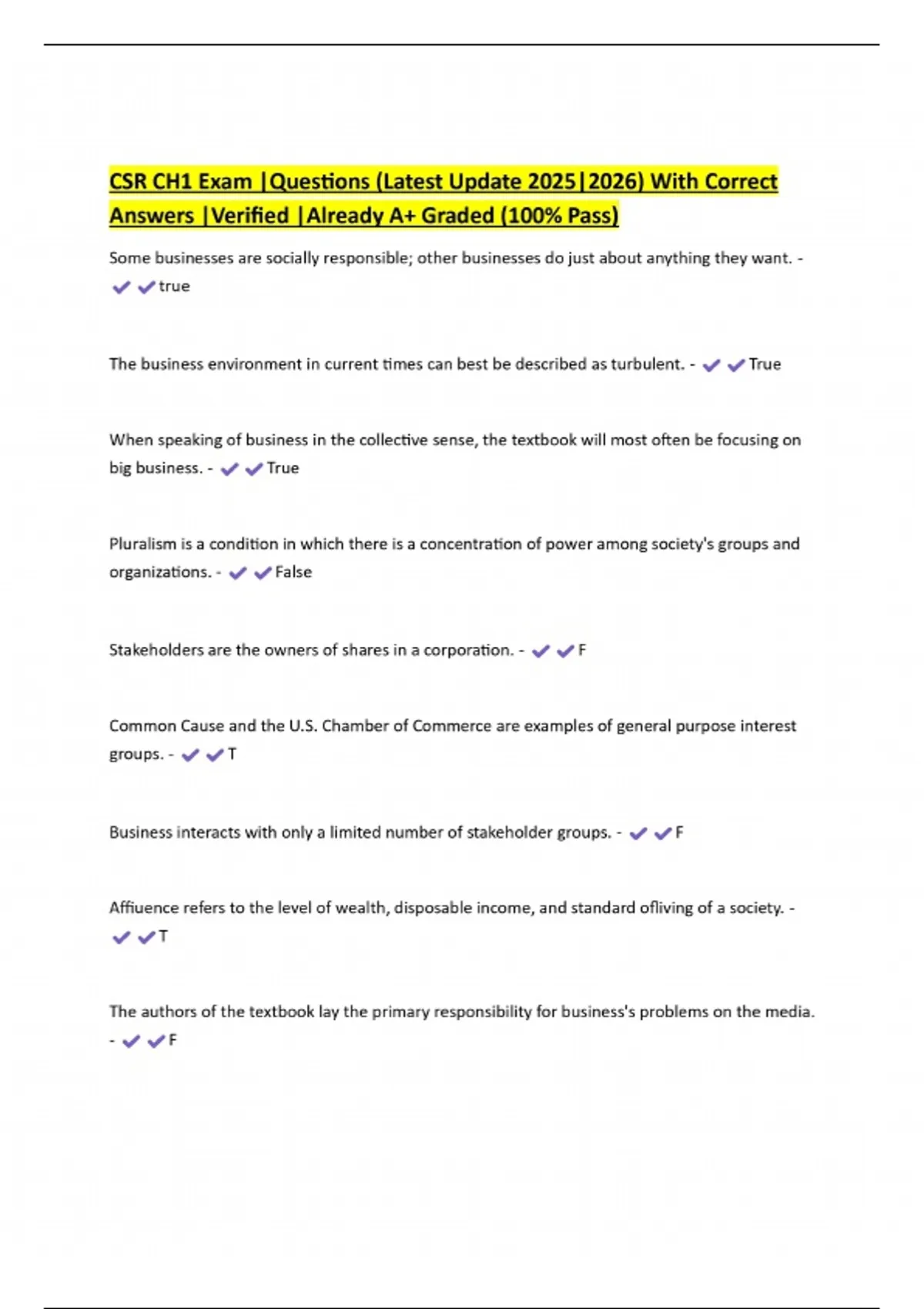 CSR CH1 Exam |Questions (Latest Update 2025|2026) With Correct Answers |Verified |Already A+ Graded (100% Pass)