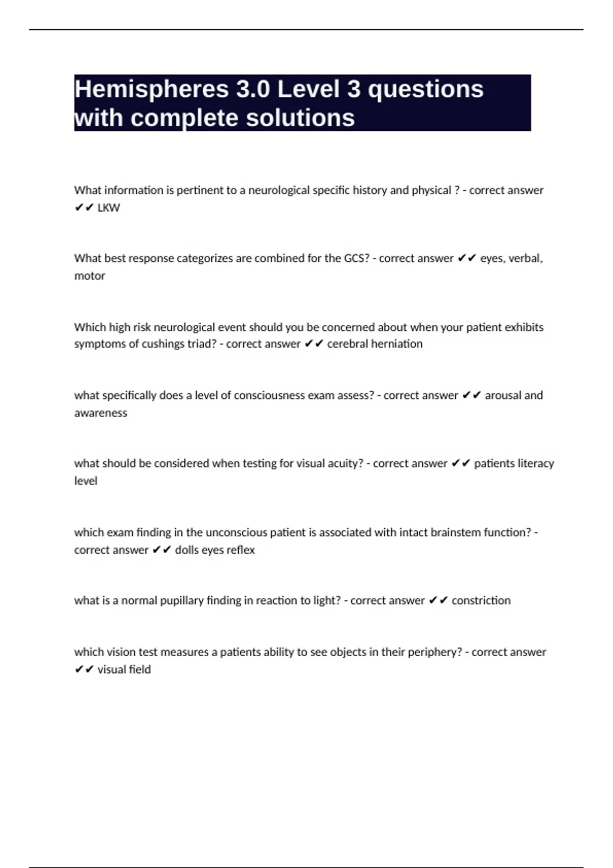 1 Exam (elaborations) Hemispheres 3.0 LEVEL VII Discharge & Prevention well answered already passed 2 Exam (elaborations) Hemispheres 3.0 Level II Stroke Pathophysiology questions well answered 3 Exam (elaborations) hemisphere 3.0 Level 6 questions well answered 4 Exam (elaborations) Hemispheres 3.0 Level 2 questions with correct answers 5 Exam