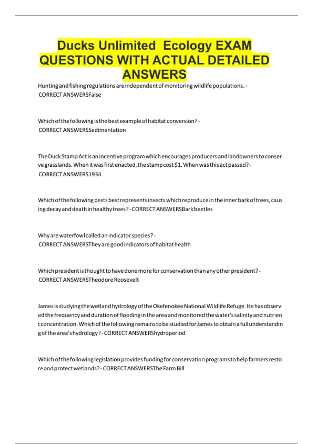 DUCKS UNLIMITED ECOLOGY CONSERVATION & MANAGEMENT ACTUAL EXAM QUESTIONS WITH CORRECT DETAILRD ANSWERS RATED A+ LATEST UPDATE