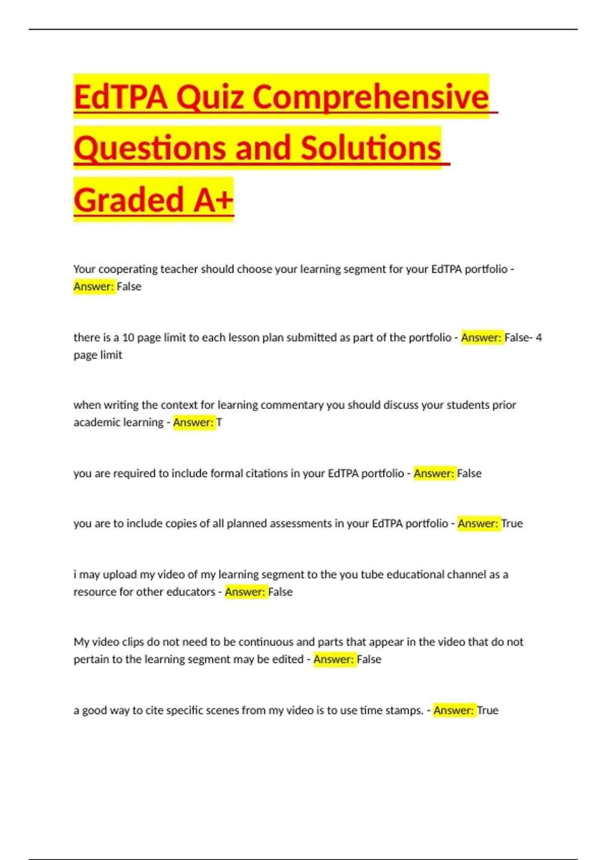 edTPA Comprehensive Questions and Solutions Graded A Package Deal