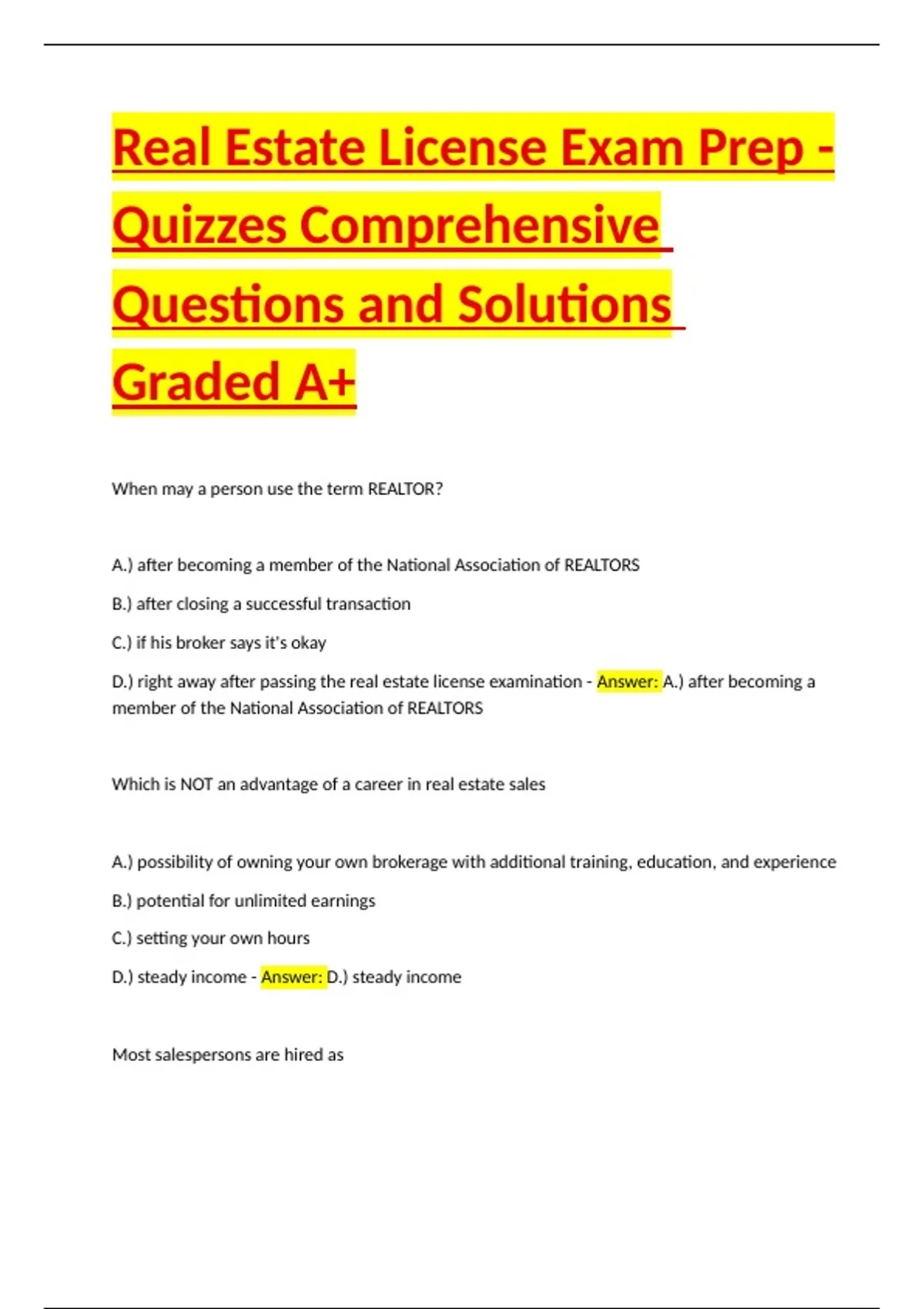 Real Estate Practice Exam Comprehensive Questions and Solutions Graded A Package Deal