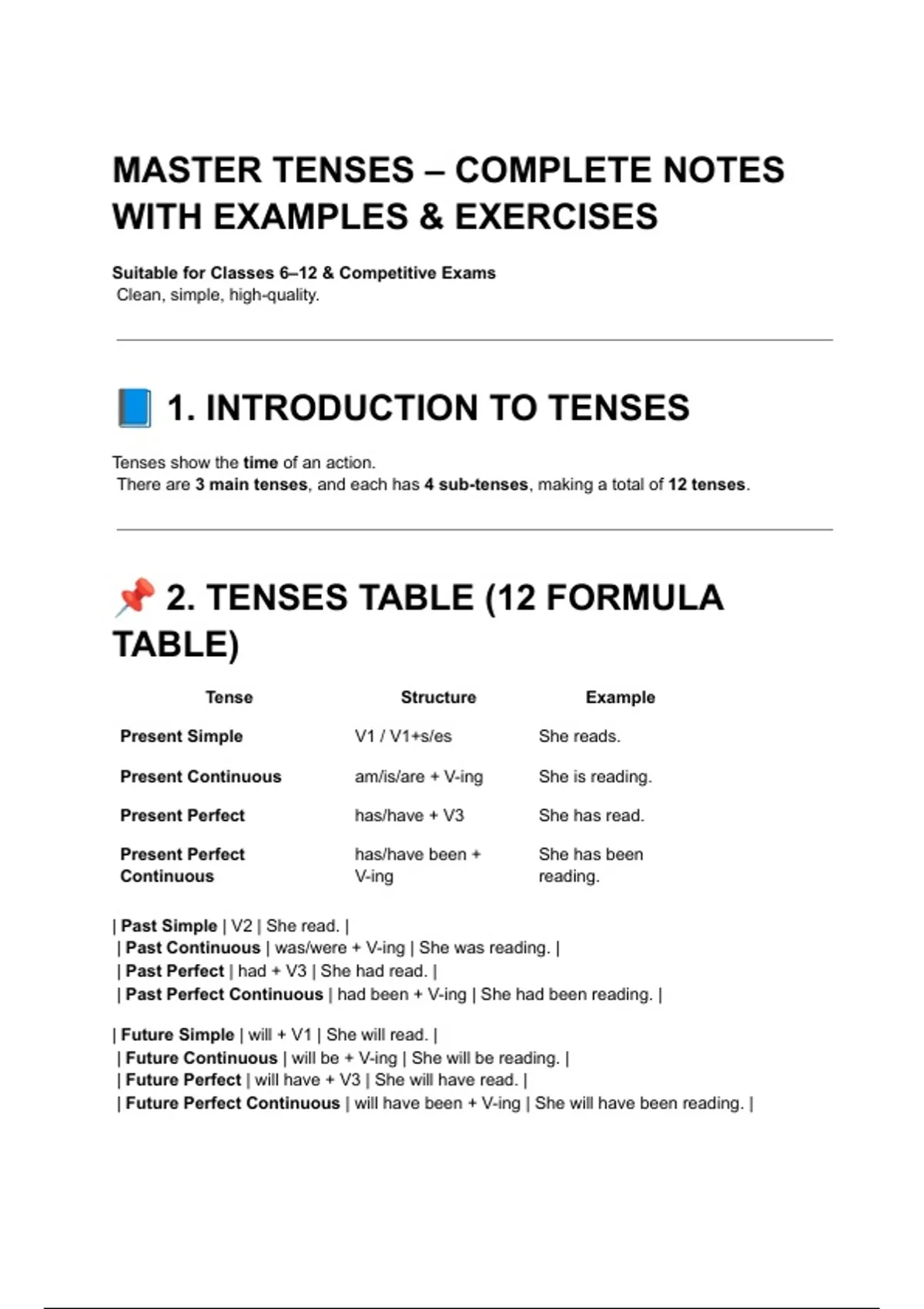 All major grammar topics in one pack: Tenses, Voice, Speech, Parts of Speech, Modals, Determiners, Articles & More. Includes rules, examples and exercises. Ideal for classes 6-12 and exam preparation.