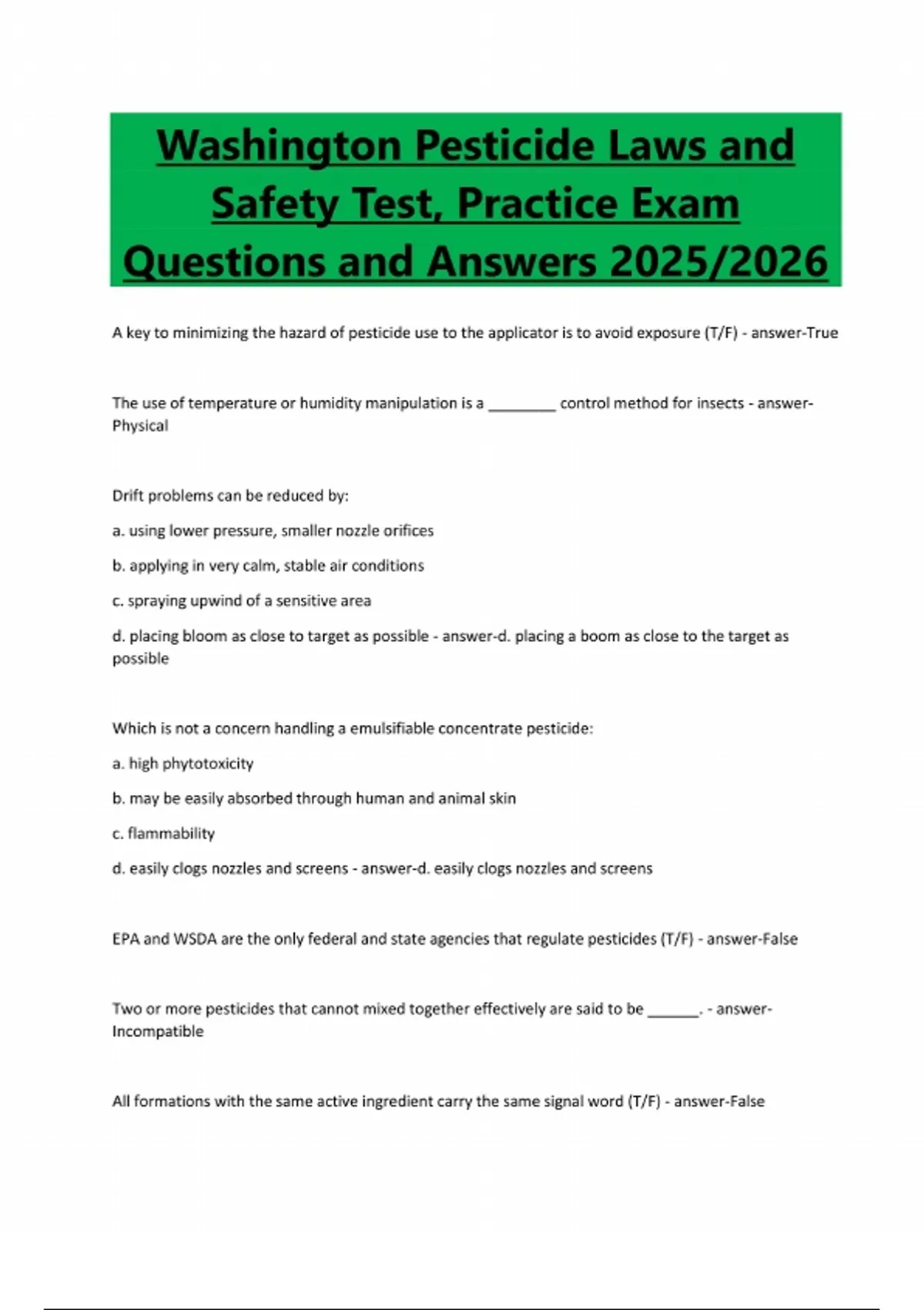 Washington Pesticide Laws And Safety / Pest Management Study Manual Exam With 100% Correct Answers | Updated 2025/2026 Washington Pesticide Laws and Safety Test, Practice Exam Questions and Answers 2025/2026