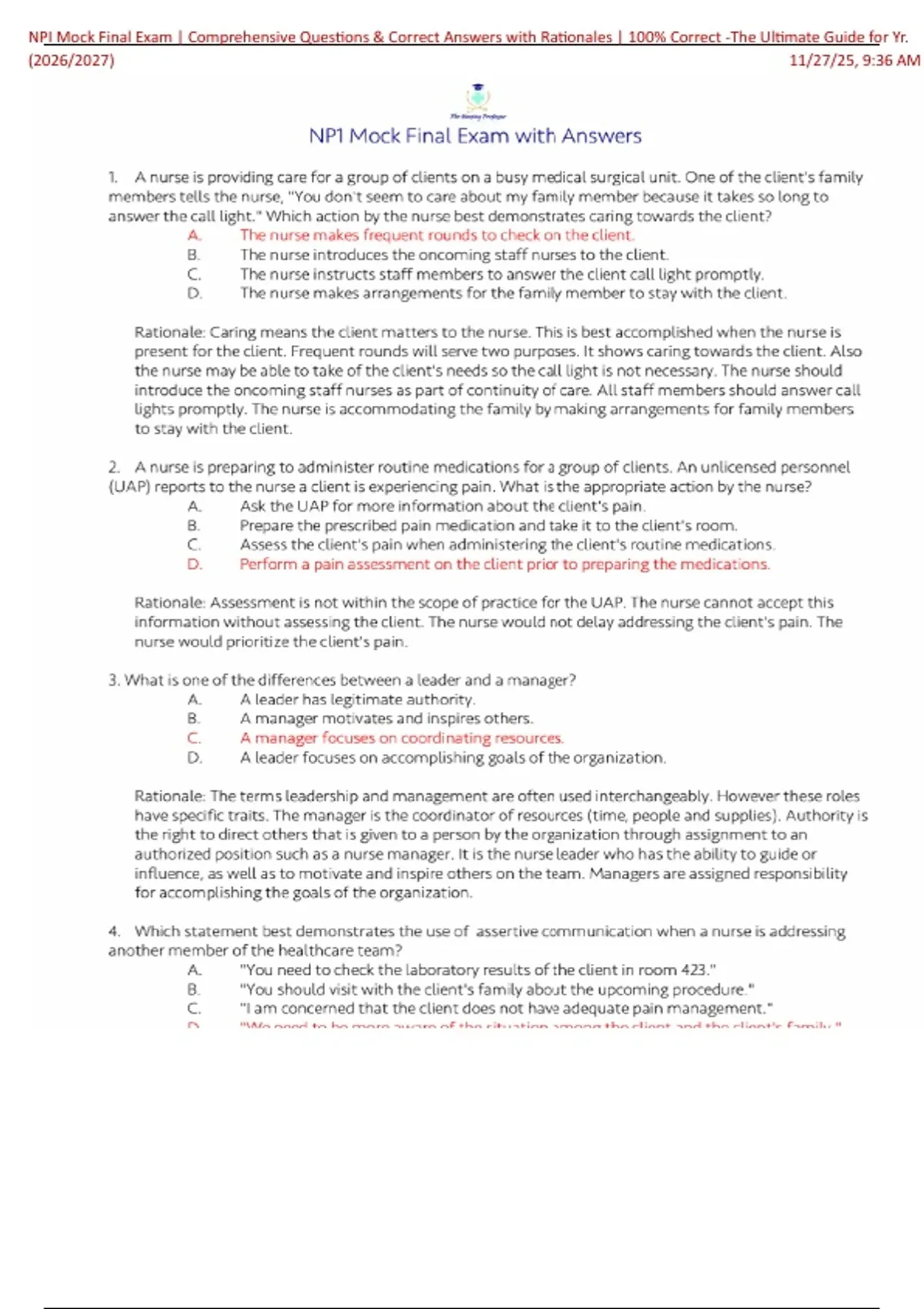 1 Exam (elaborations) NPI Mock Final Exam | Comprehensive Questions & Correct Answers with Rationales | 100% Correct -The Ultimate Guide for Yr. (2026/2027) 2 Exam (elaborations) NP2 Unit 2 Maternity Mock Exam 2025 | Comprehensive Questions & Correct Answers with Rationales | 100% Correct -The Ultimate Guide for Yr. (2026/2027)