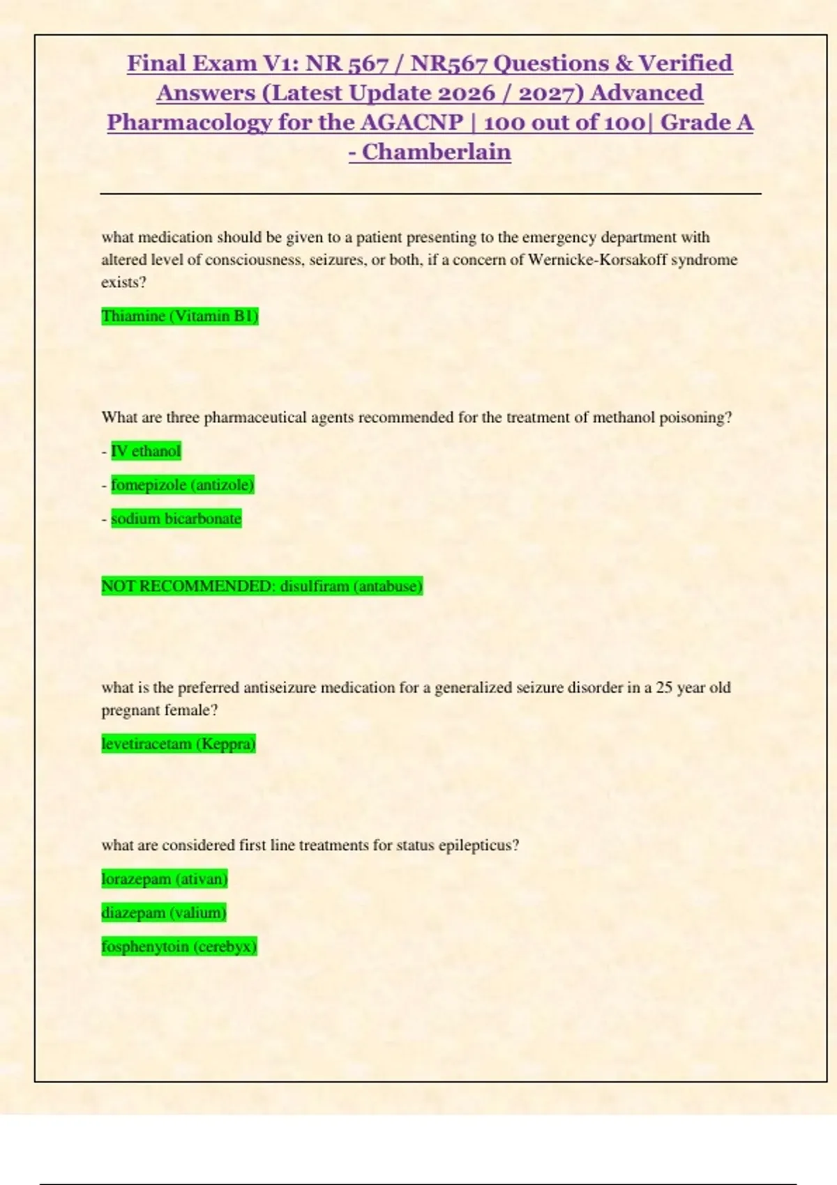 This comprehensive NR 567 bundle includes the midterm exam, both Final Exam Versions 1 and 2, and the complete final exam review. All files are updated for 2026/2027 and contain verified answers tailored to Chamberlain University's AGACNP program. Ideal for students who want full exam coverage and guaranteed high-level pharmacology preparation.