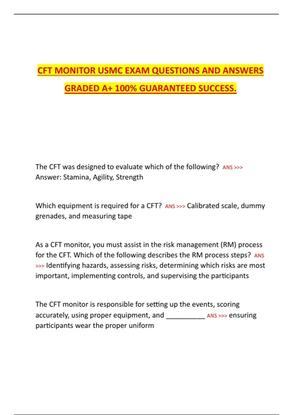 CFT Monitor Certification Exam – Complete Questions and Answers (Latest Update • Graded A+) CFT Monitor USMC Exam – Complete Questions and Answers (Graded A+ • 100% Guaranteed Success)