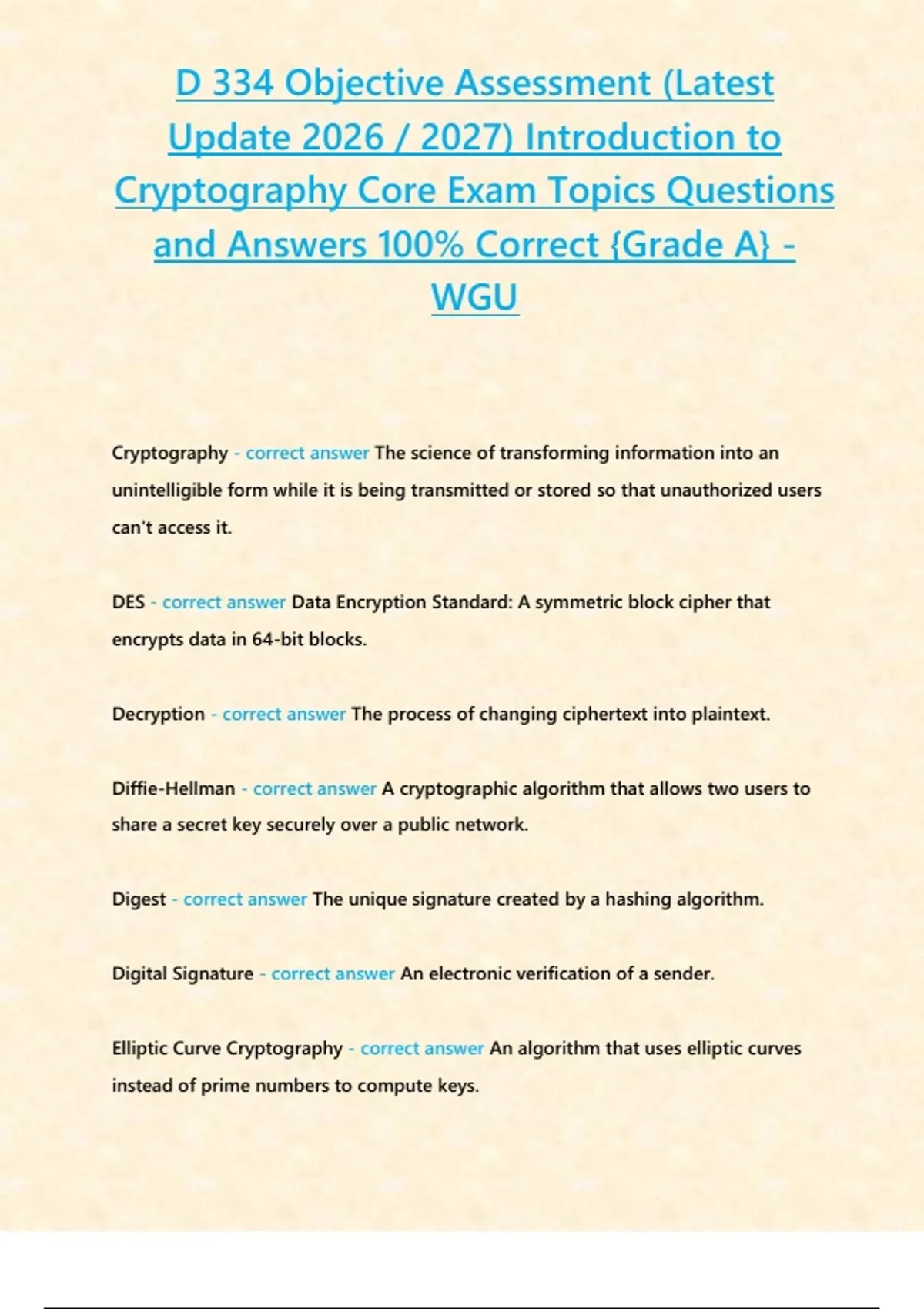 D 334 Objective Assessment (Latest Update 2026 / 2027 STUDY BUNDLE PACKAGE WITH SOLUTIONS) Introduction to Cryptography Core Exam Topics Questions and Answers 100% Correct {Grade A} - WGU