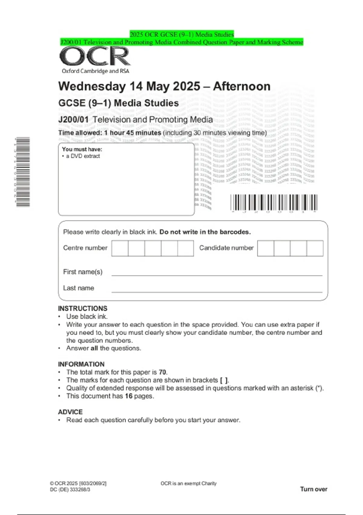 2025 OCR GCSE (9–1) Media Studies J200/01 Television and Promoting Media Combined Question Paper and Marking Scheme 2 Exam (elaborations) 2025 OCR GCSE (9–1) Media Studies J200/02 Music and News Combined Question Paper and Marking Scheme