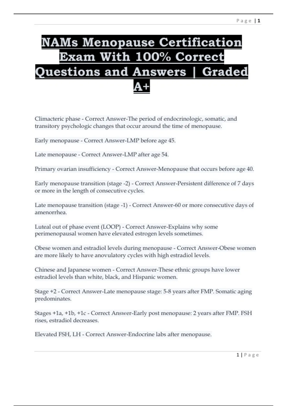 This document covers fully solved questions from the NAMS Menopause Certification Exam, providing correct answers to all included exam items. It is designed to support learners preparing for the NAMS certification by offering clear and accurate solutions. The material is useful for exam review, self-study, and comprehensive preparation.