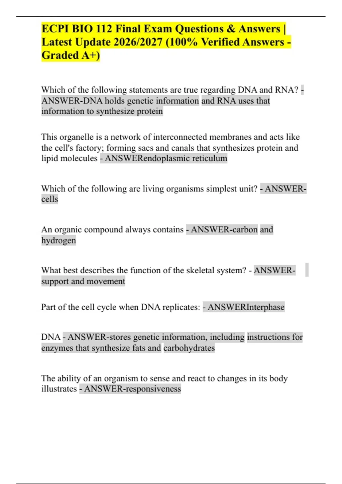 ECPI BIO 112 Final Exam Questions & Answers | Latest Update 2026/2027 | ECPI Bio 112 Final Exam Questions and Answers | ECPI Bio 116 A&P 2 Exam Questions With Correct Answers & ECPI BIO 116 A&P 2 FINAL (ACTUAL 2026/2027) EXAM CHAPTERS 20-22 QUESTIONS AND VERIFIED ANSWERS.
