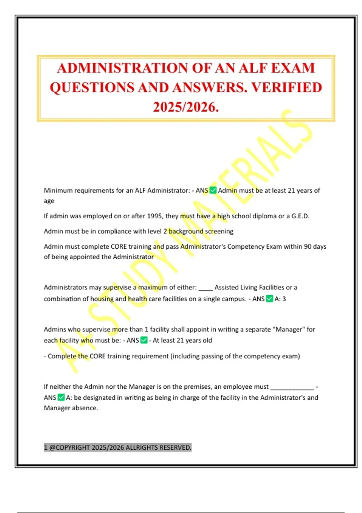 ALF ADMINISTRATORS CORE EXAM QUESTIONS AND ANSWERS. VERIFIED 2025/2026.ALF ADMINISTRATORS CORE EXAM QUESTIONS AND ANSWERS. VERIFIED 2025/2026.