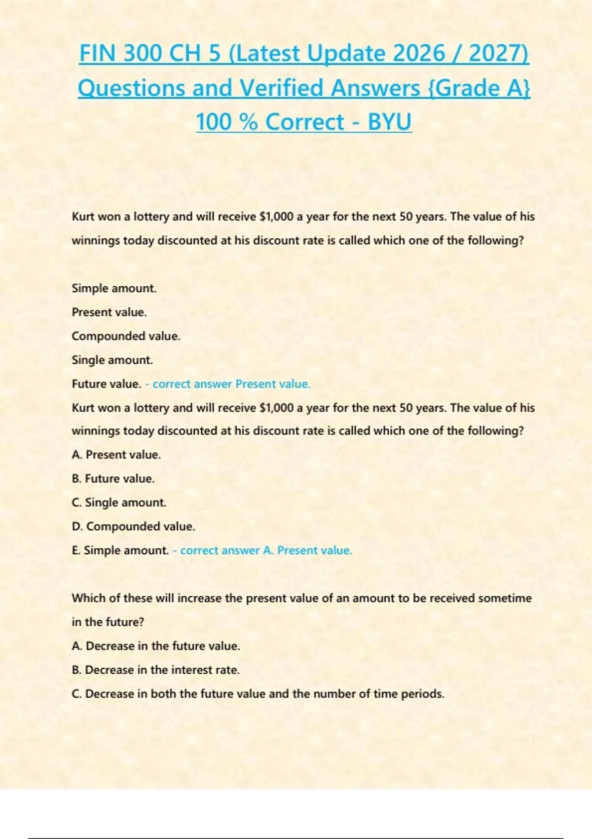 FIN 300 exams (Latest Update STUDY BUNDLE PACKAGE WITH SOLUTIONS) Questions and Verified Answers -Grade A- 100 - Correct - BYU.
