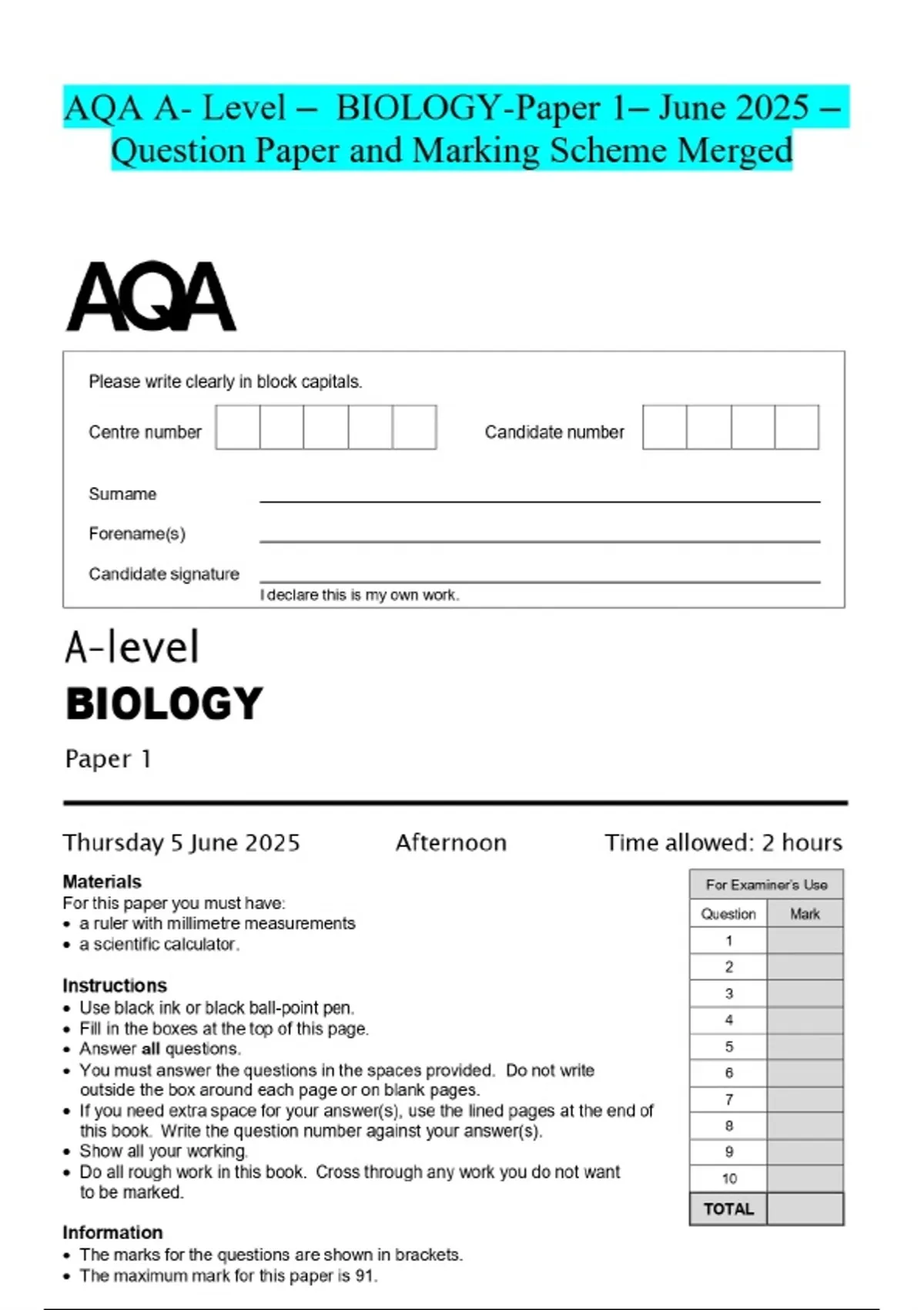AQA A- Level - BIOLOGY-Paper 1- June 2025 — Question Paper and Marking Scheme Merged