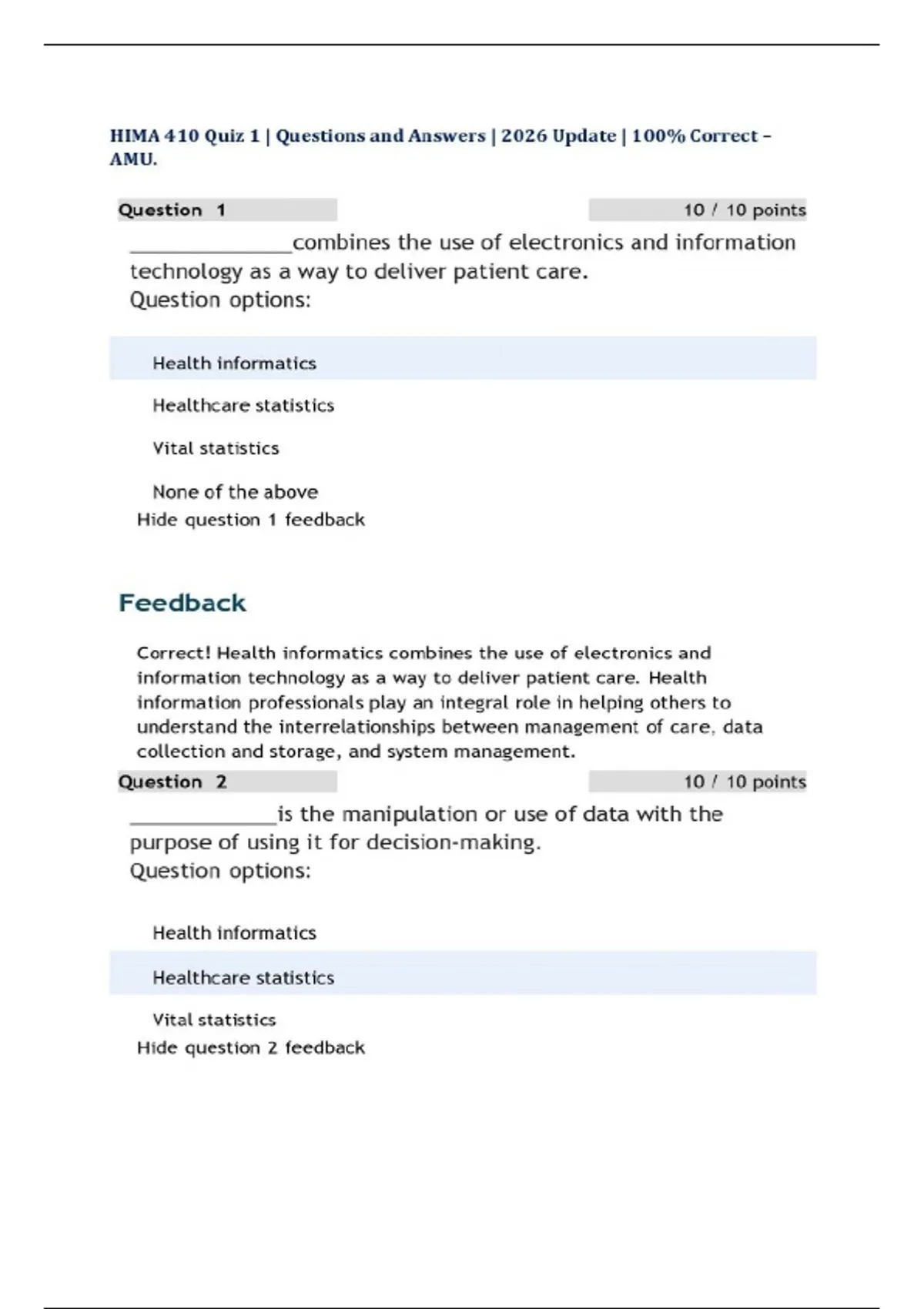 HIMA 410 Final Exam HIMA 410 Week 8 Assignment EHRGo HIMA 410 Week 7 Assignment | Presenting Data Results HIMA 410 Week 5 Assignment EHRGo HIMA 410 Week 4 Data Model Assignment HIMA 410 Week 3 Assignment: EHRGo - Orientation to Data Analytics HIMA 410 Week 2 Assignment: Integration and System Functions HIMA 410 Quiz 2 HIMA 410 Quiz 1