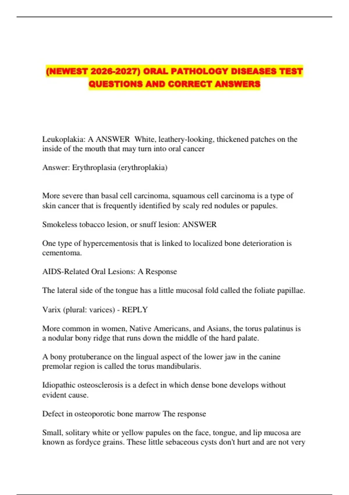 (NEWEST ) ORAL PATHOLOGY DISEASES TEST QUESTIONS AND CORRECT ANSWERS