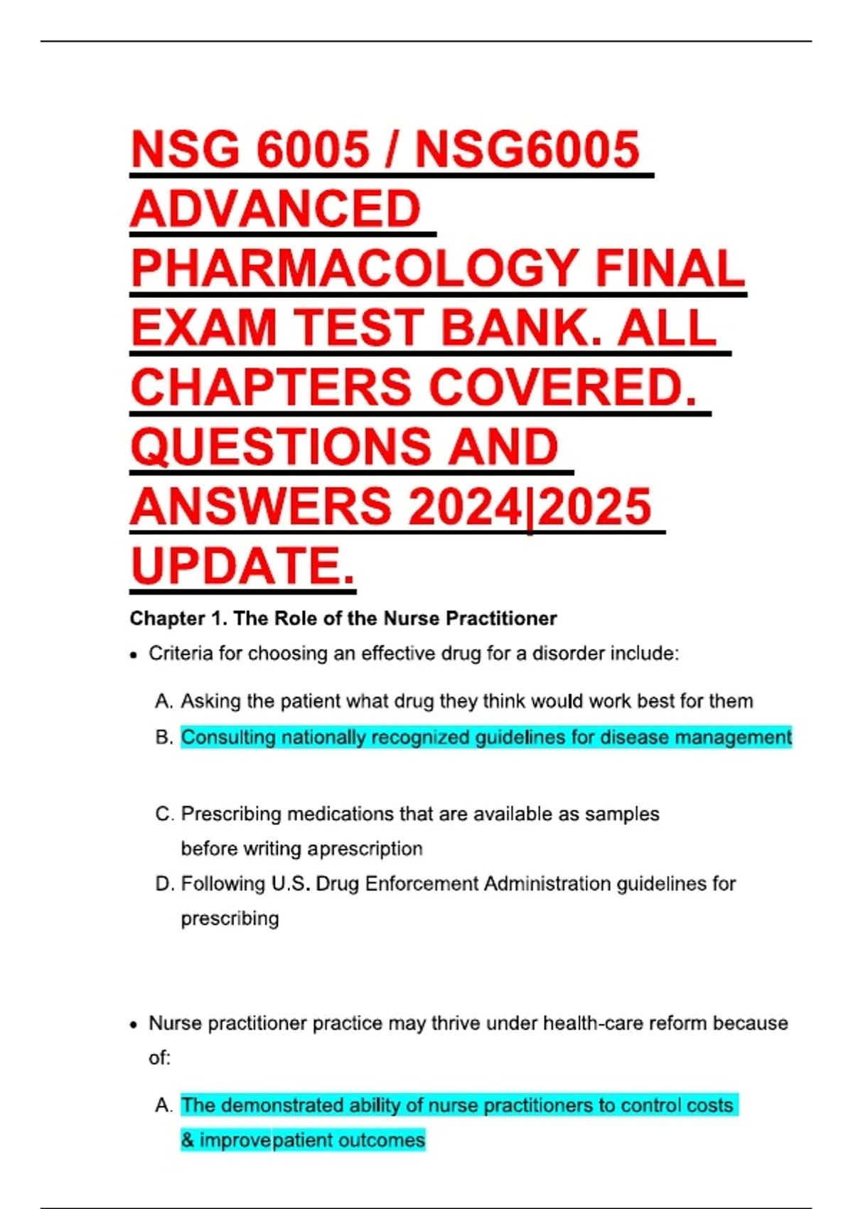 Master advanced Pharmacology concepts with this comprehensive bundle, featuring extensive practice questions, detailed explanations with solution, and fully updated content for 2025/ 2026. Designed to strengthen knowledge of complex drug therapies, enhance clinical reasoning, and maximize exam and course performance for nursing and healthcare.