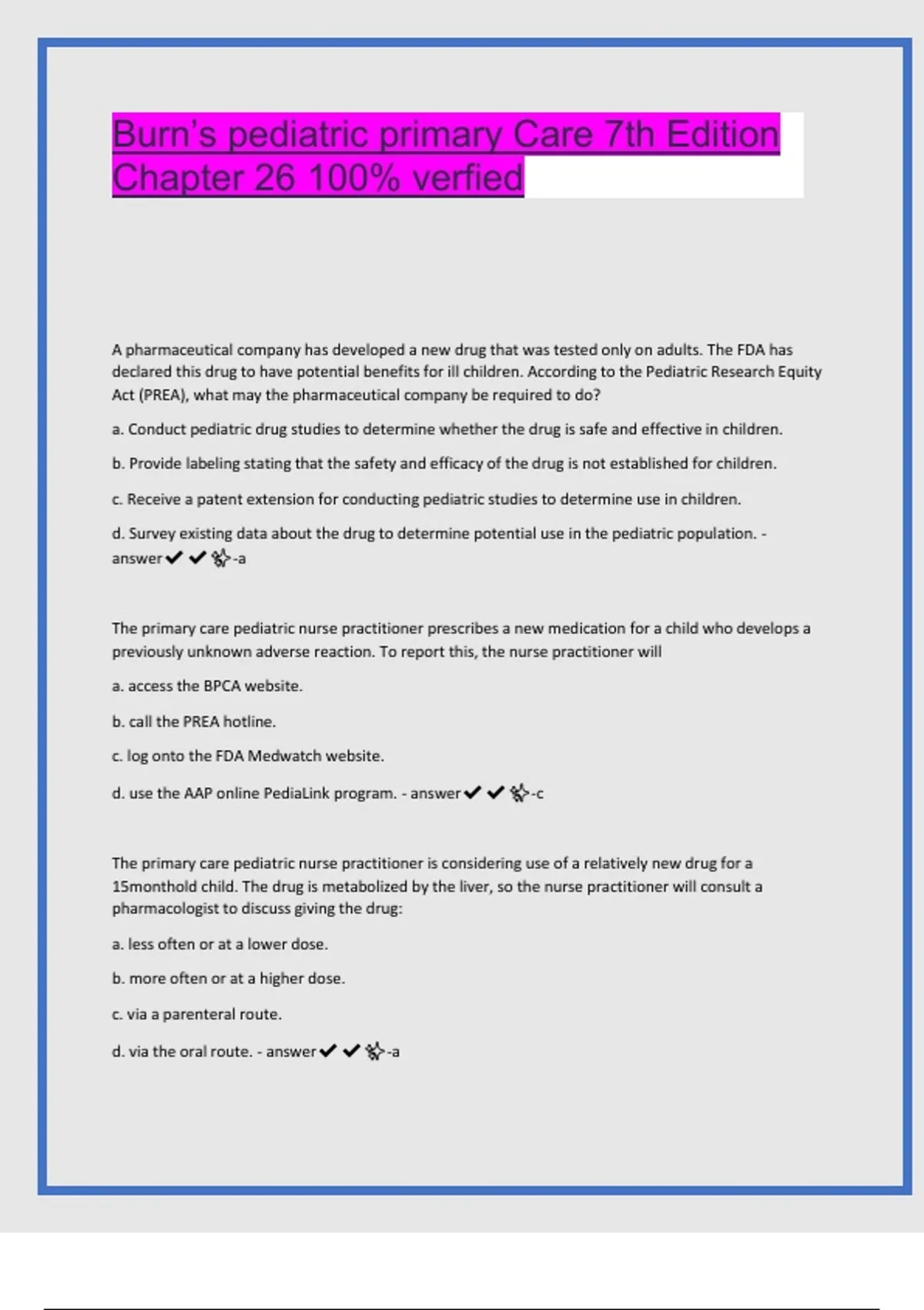 1 Exam (elaborations) Burns Pediatric Primary Care Exam 1 2025 | Verified Test Bank with Correct Questions and Answers 2 Exam (elaborations) Burns’ Pediatric Primary Care 7th Edition – Chapter 26 | 100% Verified Questions and Answers [2025/2026] 3 Exam (elaborations) Burns Chapter 4: Developmental Management in Pediatric Primary Care 2025/2026 |