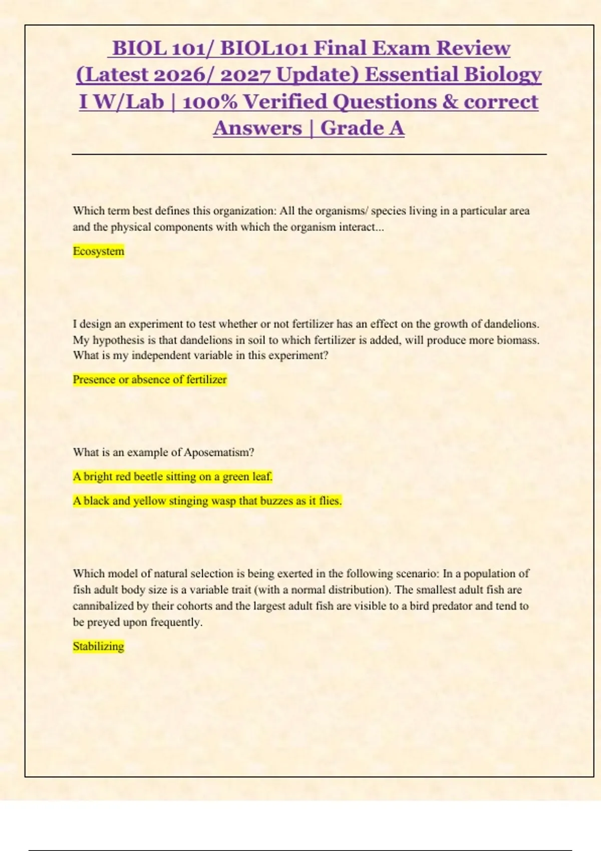 BIOL 101 / BIOL101 Module 6 Exam – Essential Biology I with Lab | Latest 2026–2027 Update | Verified Questions & Correct AnswersBIOL 101 / BIOL101 Module 4 ExamBIOL 101 / BIOL101 Module 1 ExamBIOL 101 / BIOL101 Final Exam Review