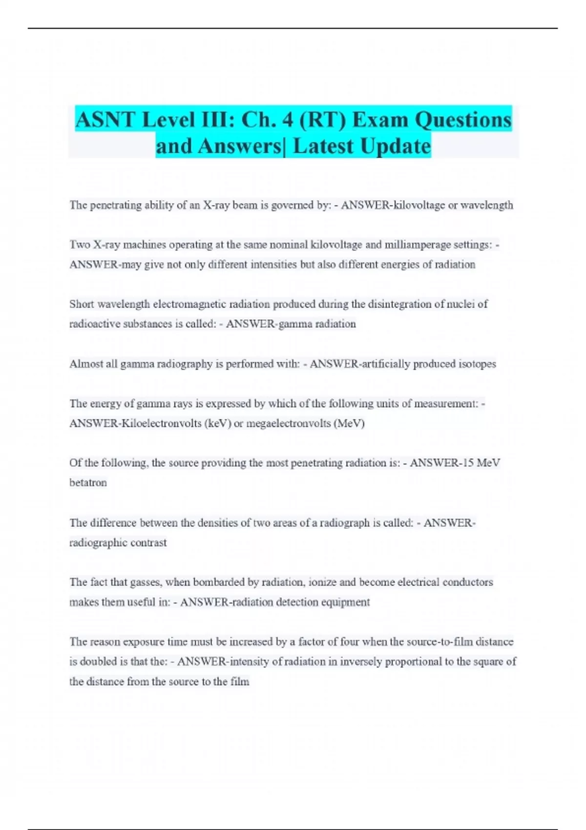 ASNT Magnetic Particle Level III Review Questions and Answers 2 Exam (elaborations) ASNT Study Guide - Industrial Radiography Radiation Safety- Questions with Correct Answers 3 Exam (elaborations) ASNT Level III: Liquid Penetrant Testing 1 of 5- Questions and Answers 4 Exam (elaborations) ASNT Level III Basic exam Questions and Answers 5 Exam (