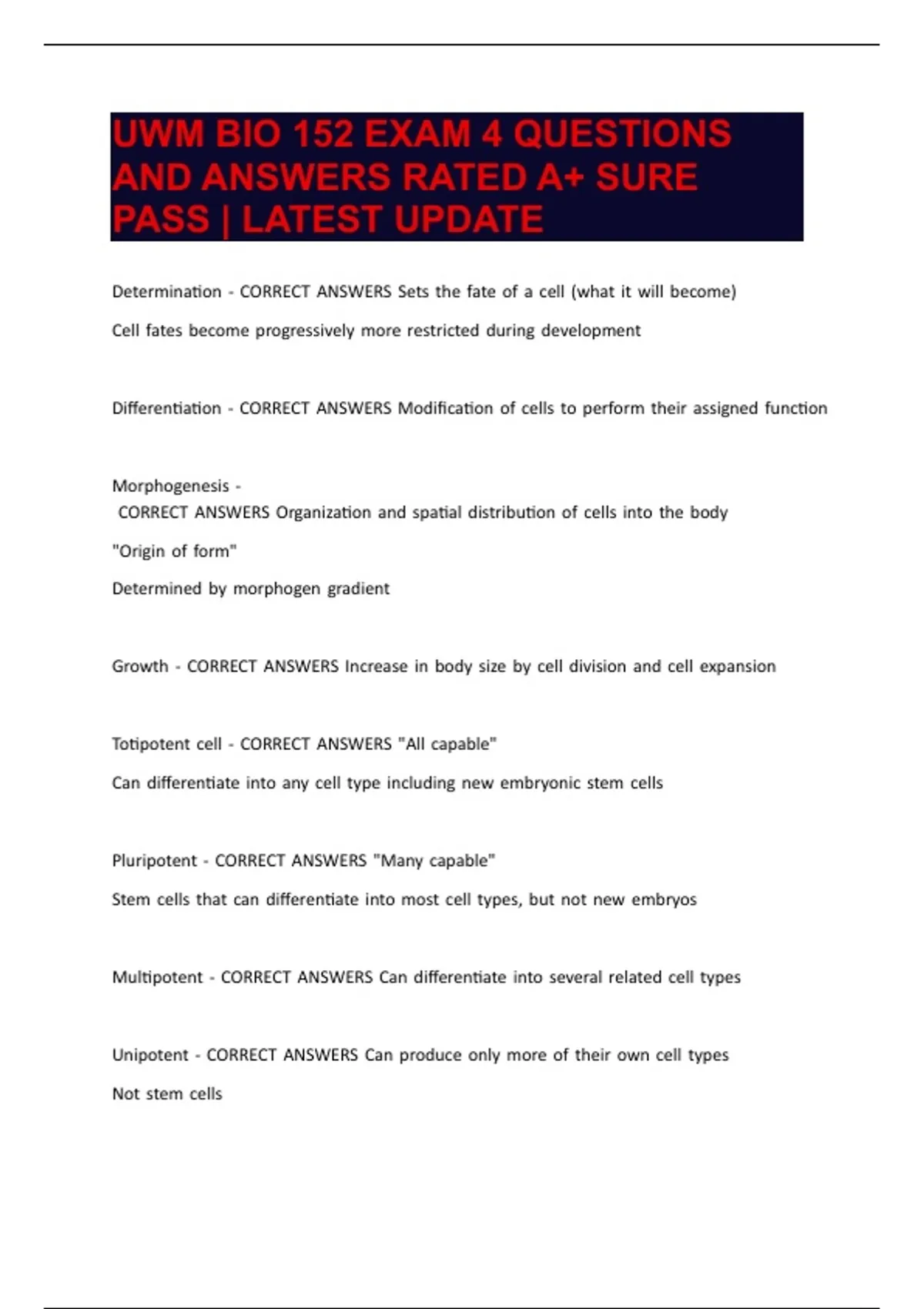 BIO 152 EXAM 4 QUESTIONS AND ANSWERS RATED A+ SURE PASS LATEST UPDATE