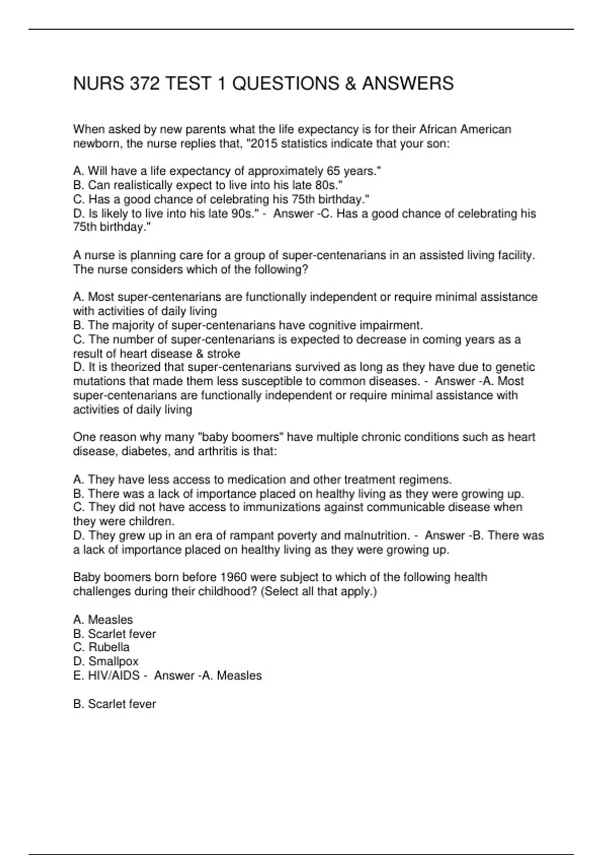 NURS 372 TEST 1 QUESTIONS & ANSWERS 2 Exam (elaborations) NURS 372 FINAL EXAM QUESTIONS & ANSWERS 3 Exam (elaborations) NURS 372 EXAM 1 QUESTIONS & ANSWERS 4 Exam (elaborations) NURS 372 TEST 2 MATERIAL - ADULT NURSING QUESTIONS 5 Exam (elaborations) NURS 372 EXAM 3 QUESTIONS & ANSWERS 6 Exam (elaborations) NURS 372 MIDTERM LECTURE NOTE QUESTI