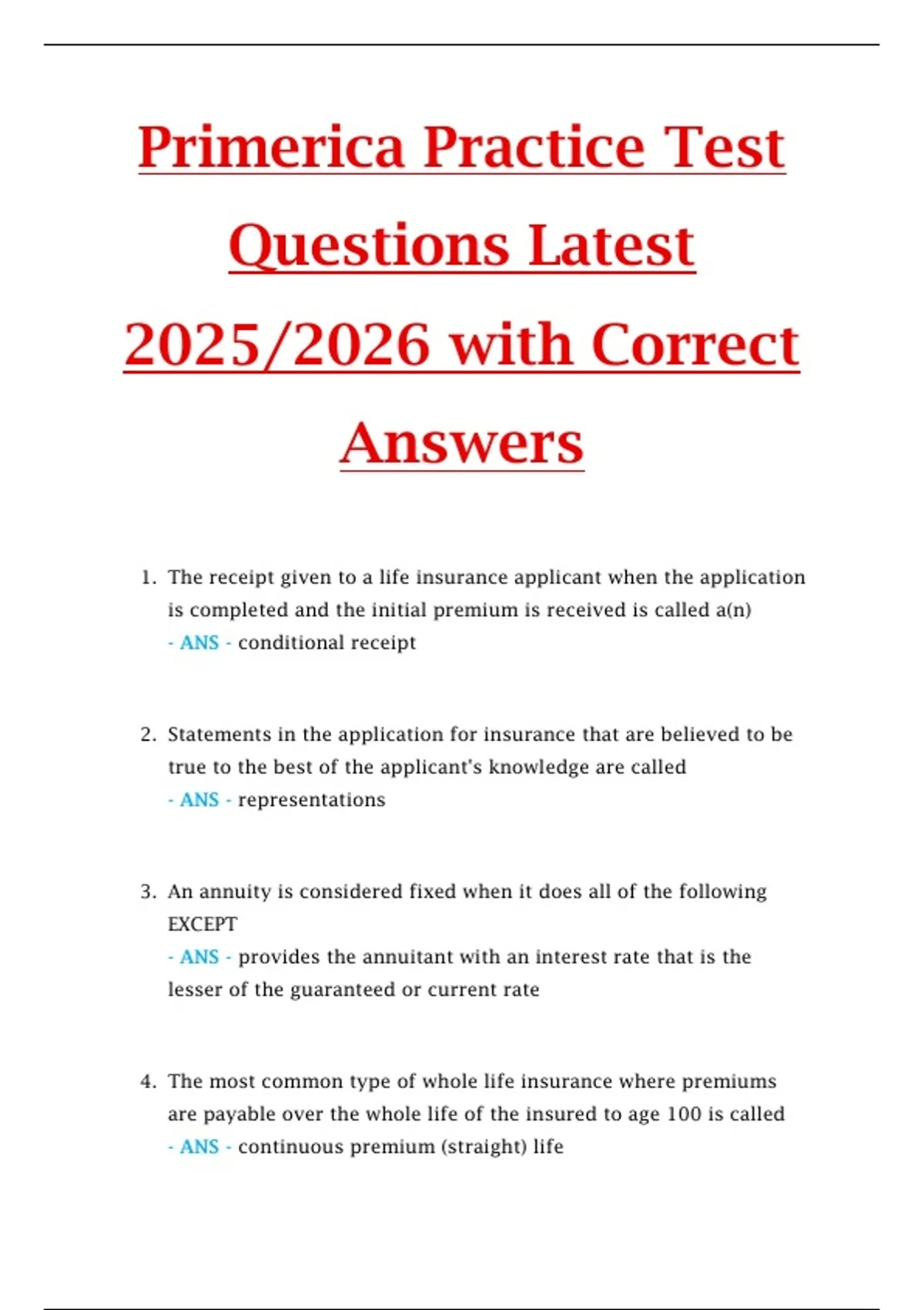 This document includes a complete package deal of reviewed multiple-choice questions for the Primerica Life Insurance Exam, updated for the 2025/2026 exam cycle and provided with correct answers. It covers core life insurance concepts, policy provisions, underwriting, ethics, and state-compliant exam topics.