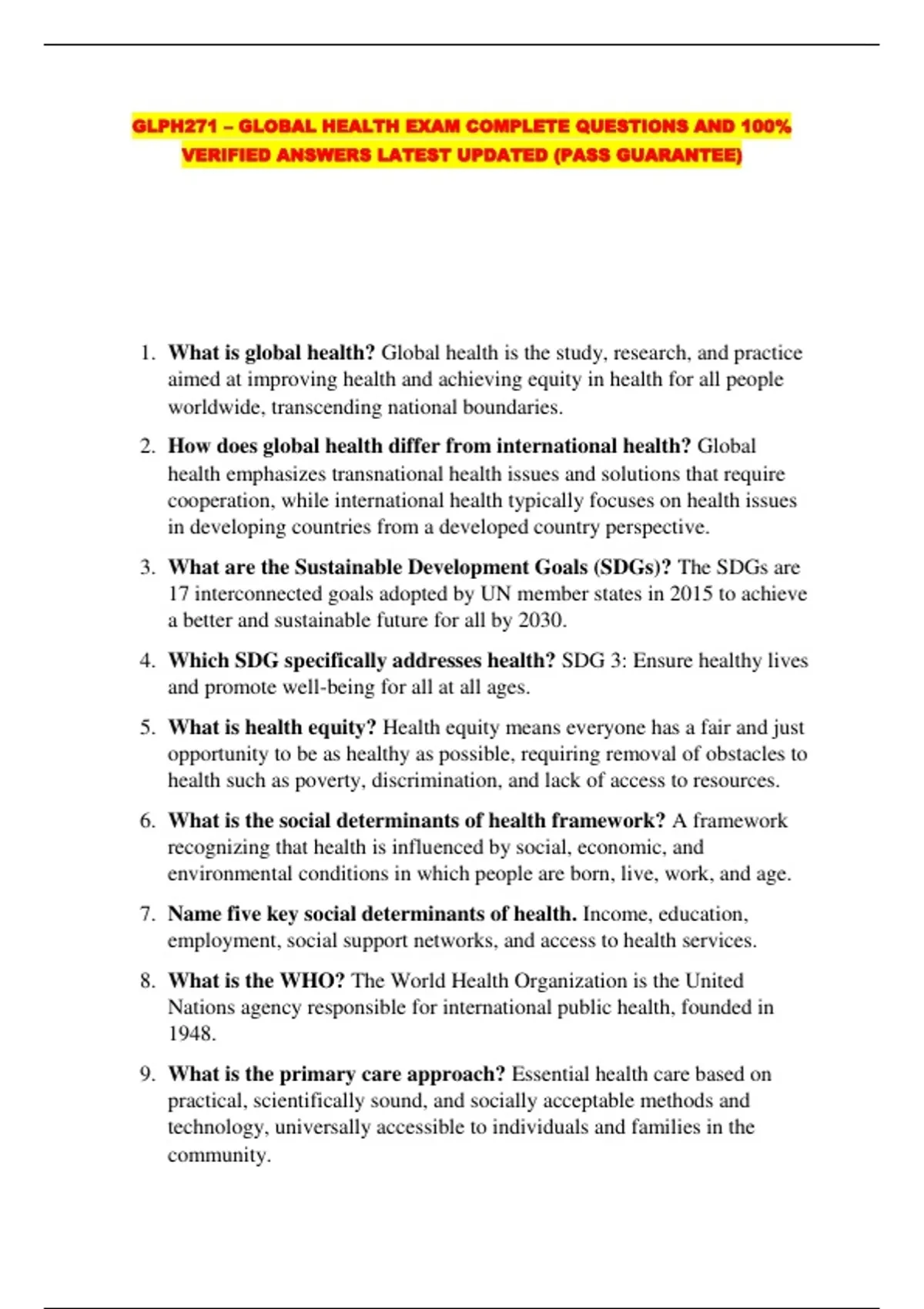 GLPH271 – GLOBAL HEALTH EXAM COMPLETE QUESTIONS AND 100% VERIFIED ANSWERS LATEST UPDATED (PASS GUARANTEE)