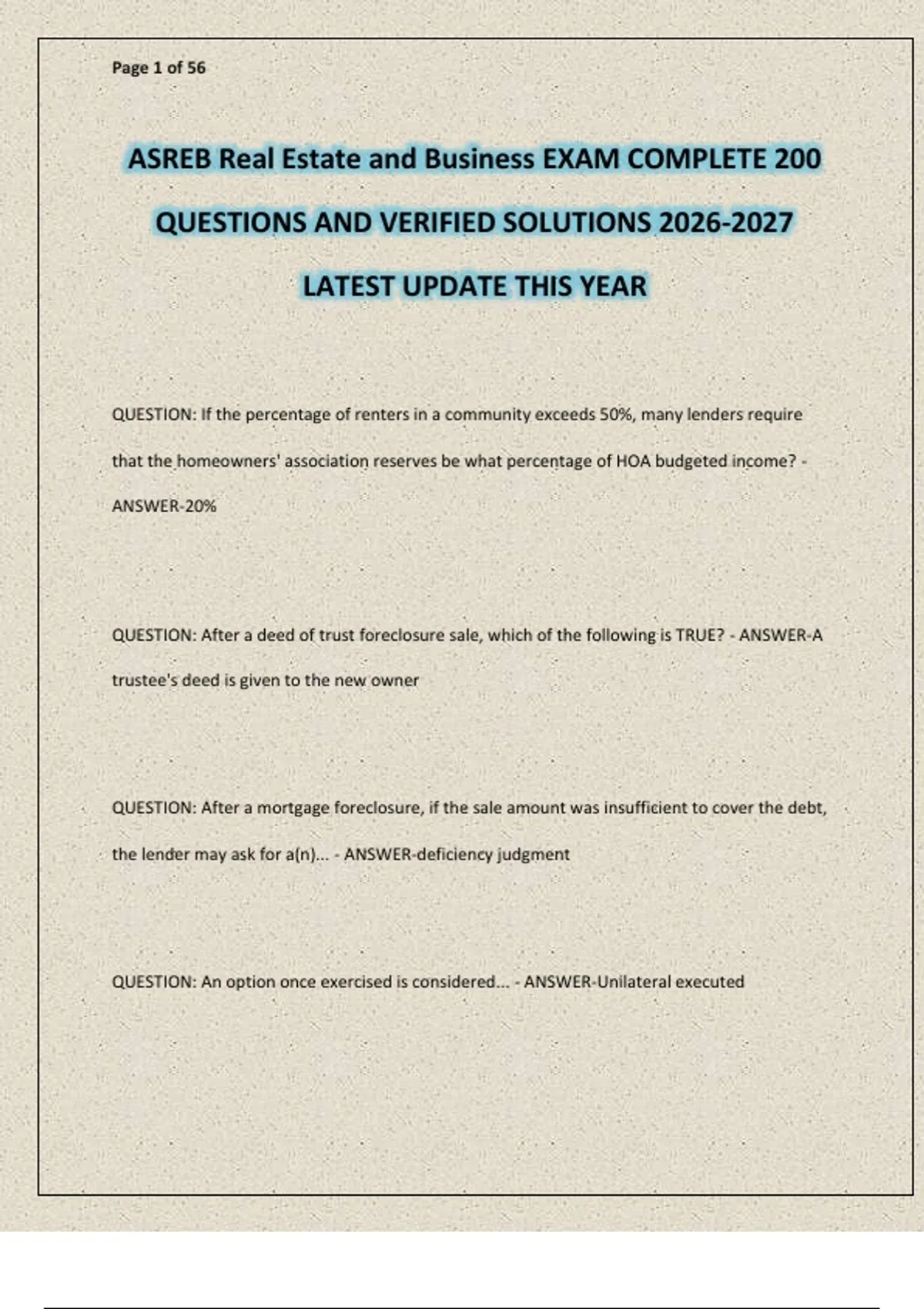 ASREB EXAM Real Estate and Business (3 VERSIONS) COMPLETE 400 QUESTIONS AND VERIFIED SOLUTIONS LATEST UPDATE THIS YEAR