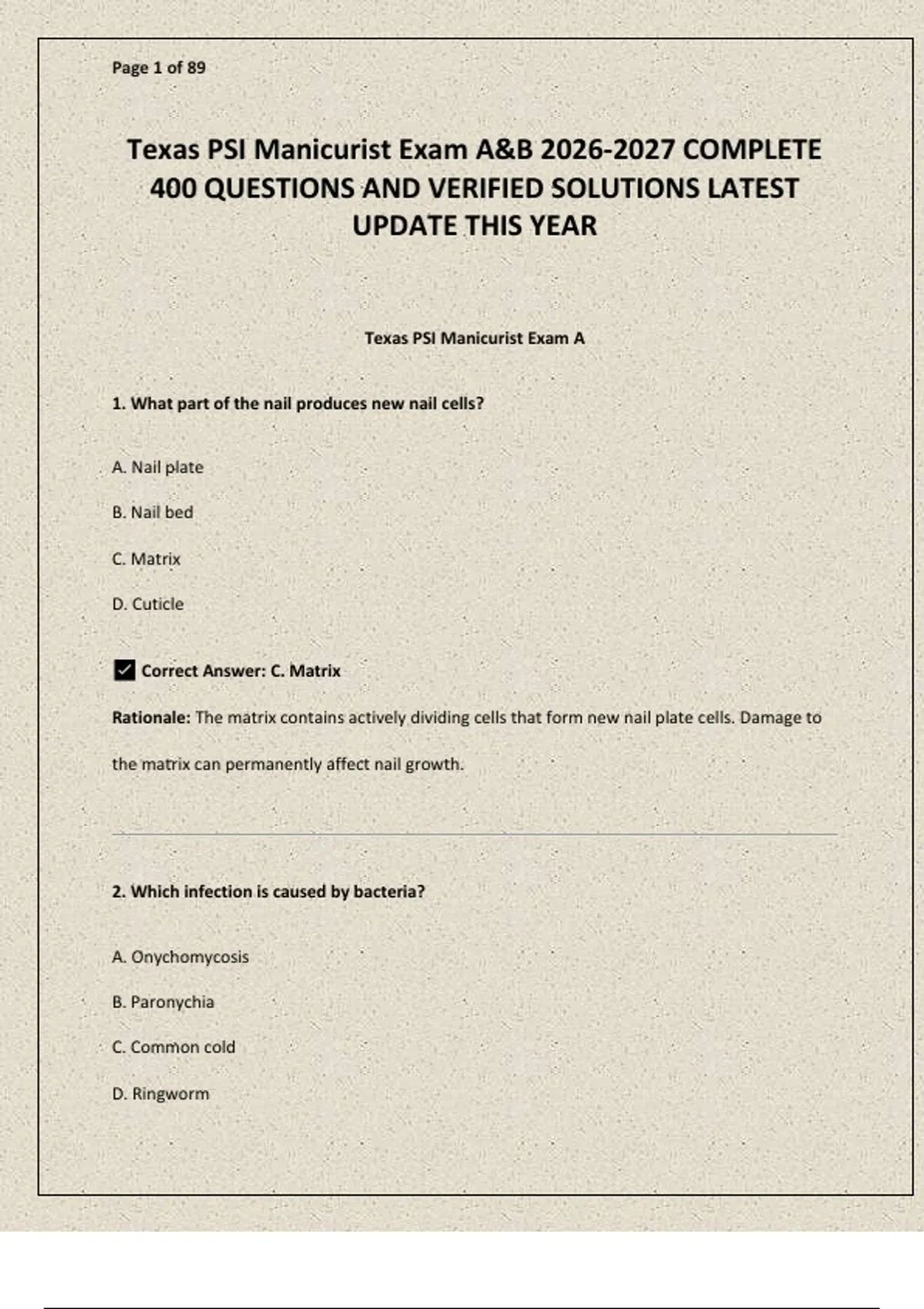 Texas PSI Manicurist Exam A&B COMPLETE 400 QUESTIONS AND VERIFIED SOLUTIONS LATEST UPDATE THIS YEAR