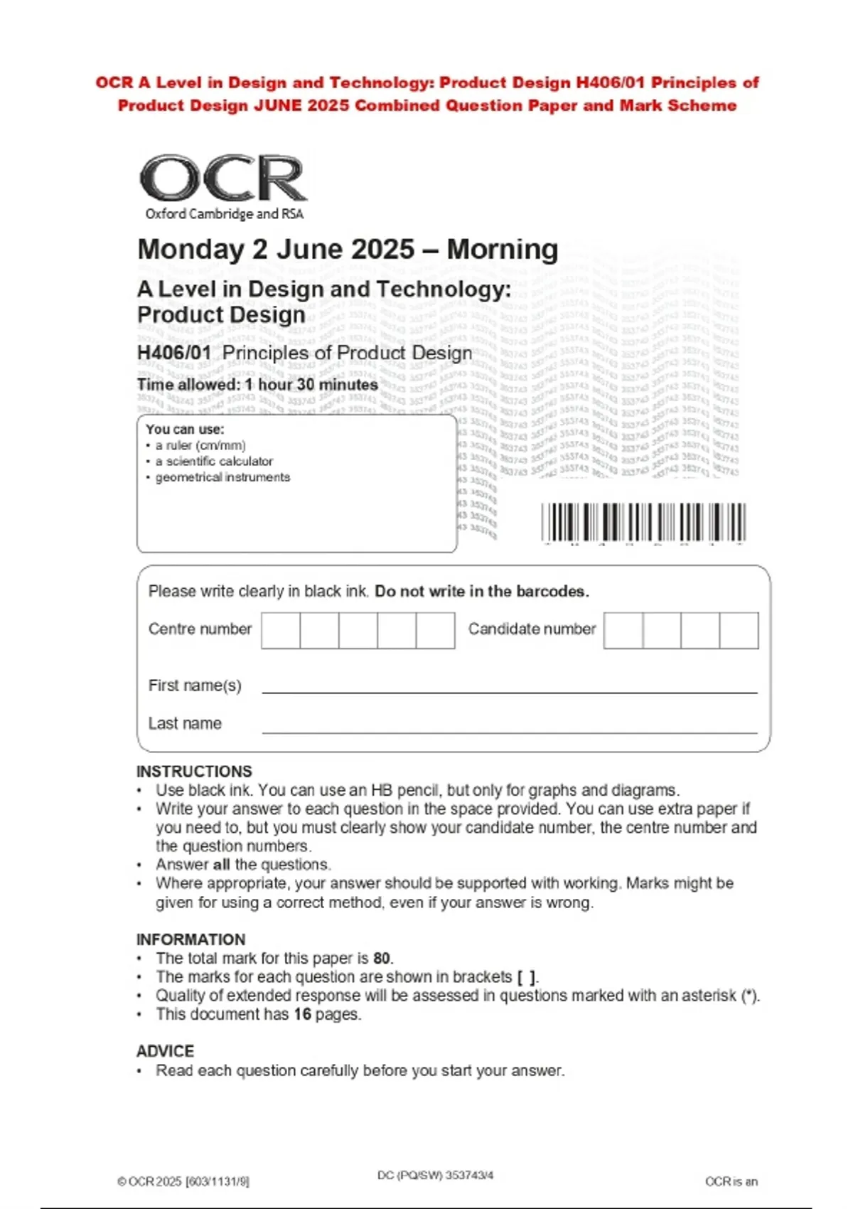 OCR A Level in Design and Technology: Product Design H406/01 Principles of Product Design JUNE 2025 Combined Question Paper and Mark Scheme