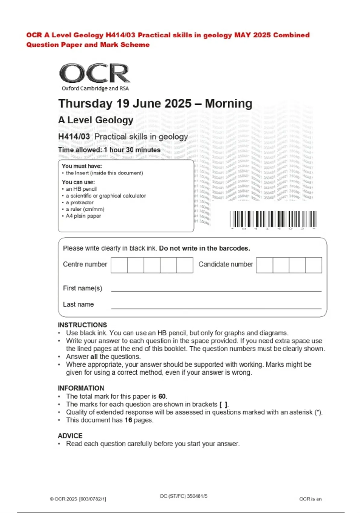 OCR A Level Geology H414/03 Practical skills in geology MAY 2025 Combined Question Paper and Mark Scheme