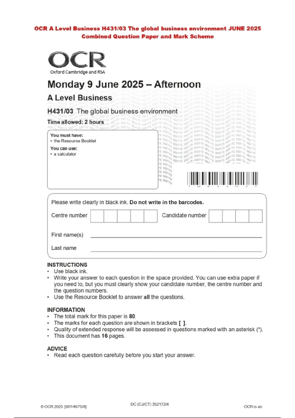 OCR A Level Business H431/03 The global business environment JUNE 2025 Combined Question Paper and Mark Scheme