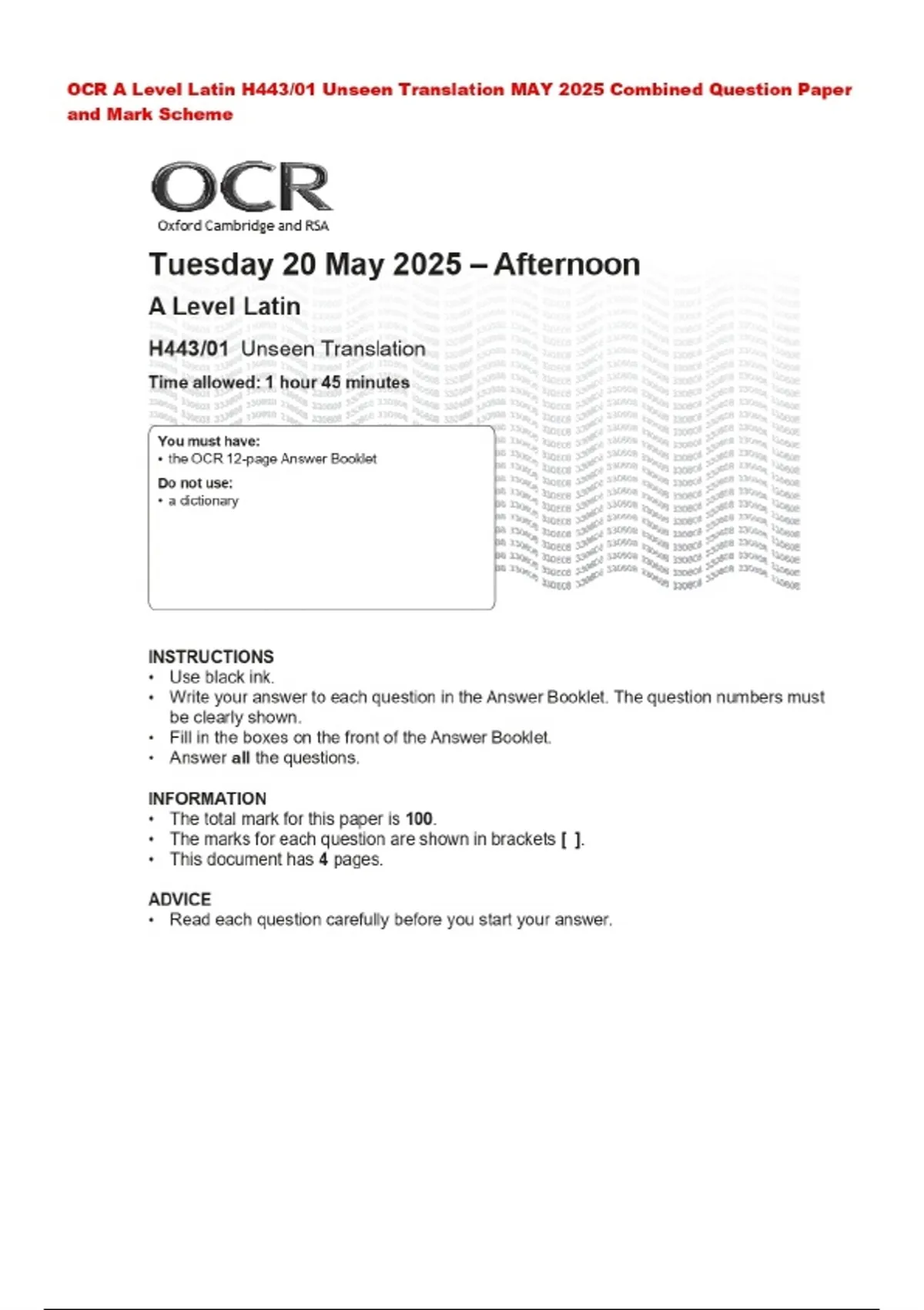 OCR A Level Latin H443/01 Unseen Translation MAY 2025 Combined Question Paper and Mark Scheme