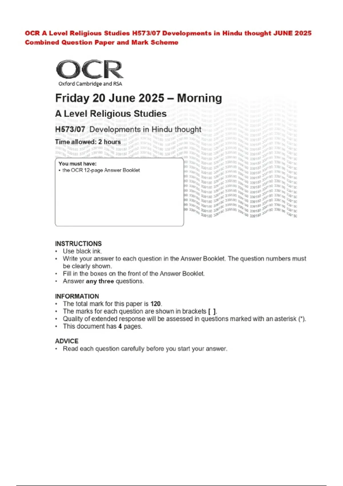 OCR A Level Religious Studies H573/07 Developments in Hindu thought JUNE 2025 Combined Question Paper and Mark Scheme