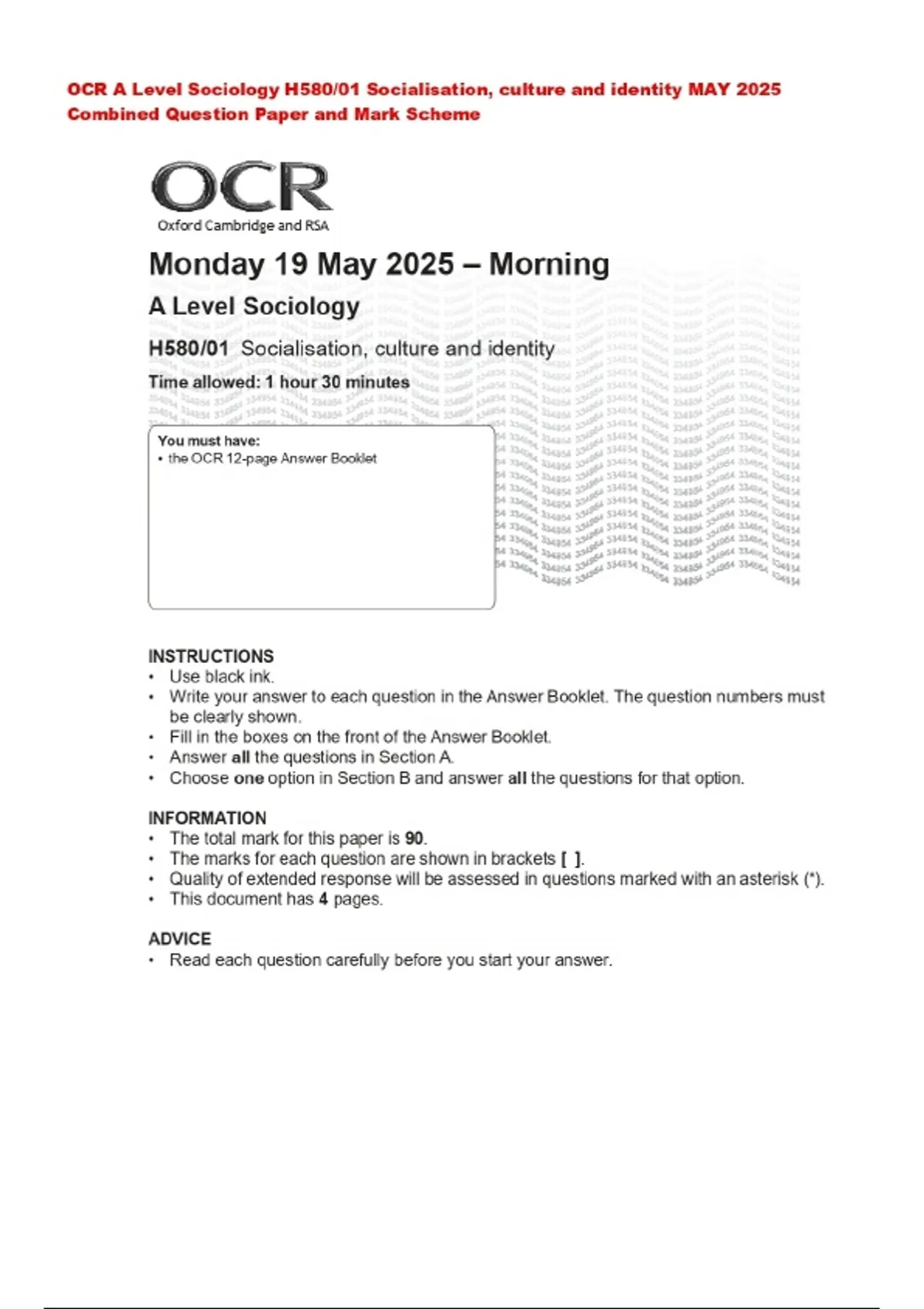 OCR A Level Sociology H580/01 Socialisation, culture and identity MAY 2025 Combined Question Paper and Mark Scheme