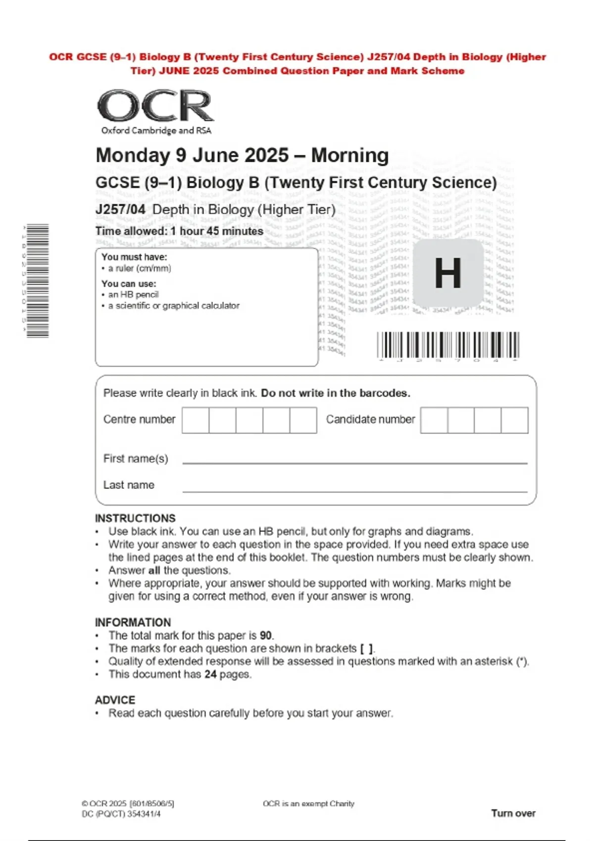OCR GCSE (9–1) Biology B (Twenty First Century Science) J257/04 Depth in Biology (Higher Tier) JUNE 2025 Combined Question Paper and Mark Scheme