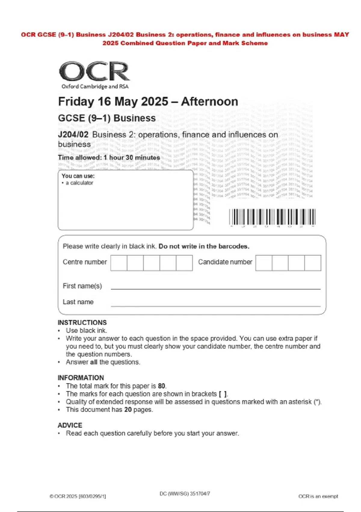 OCR GCSE (9–1) Business J204/02 Business 2: operations, finance and influences on business MAY 2025 Combined Question Paper and Mark Scheme
