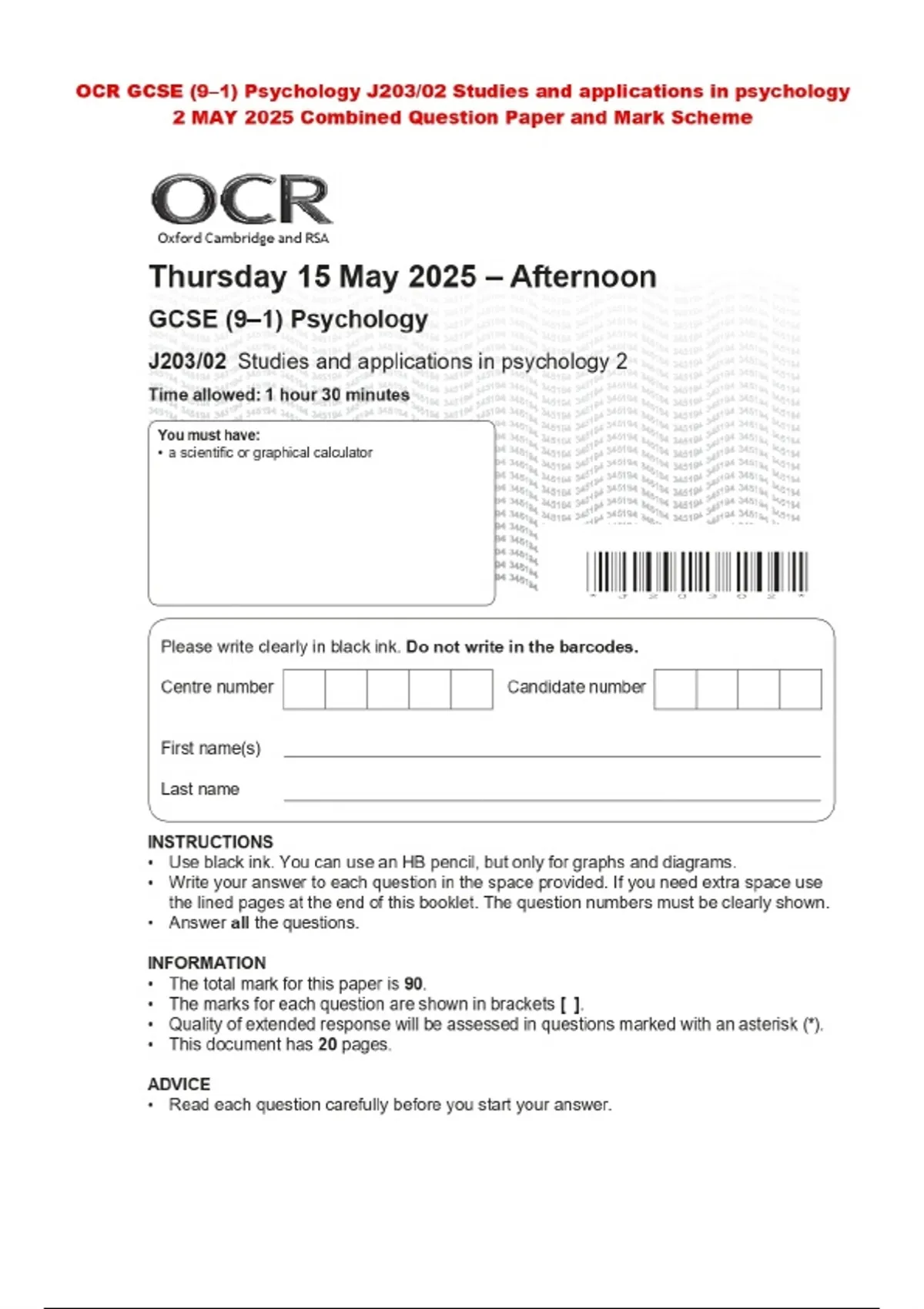 OCR GCSE (9–1) Psychology J203/02 Studies and applications in psychology 2 MAY 2025 Combined Question Paper and Mark Scheme