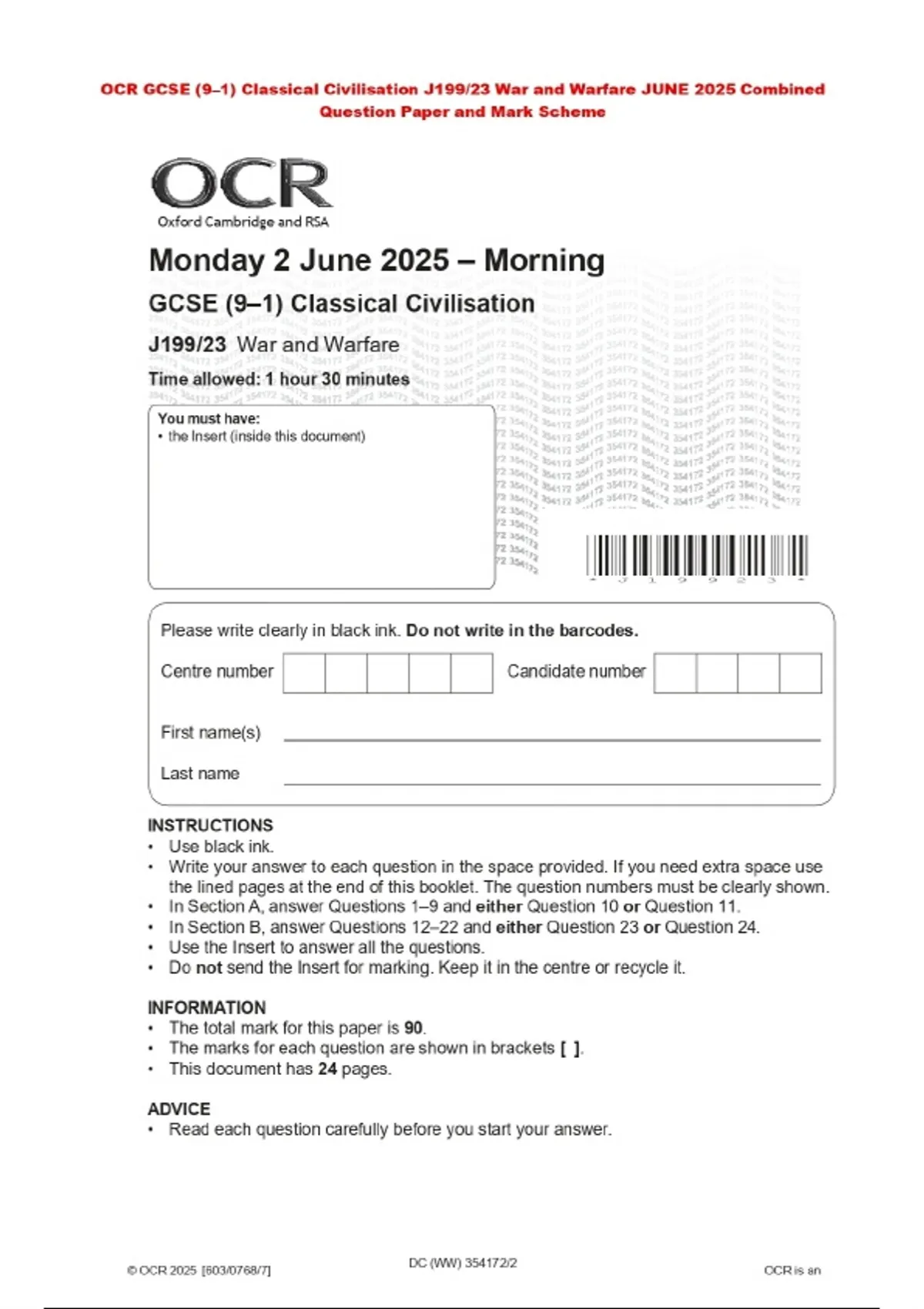 OCR GCSE (9–1) Classical Civilisation J199/23 War and Warfare JUNE 2025 Combined Question Paper and Mark Scheme