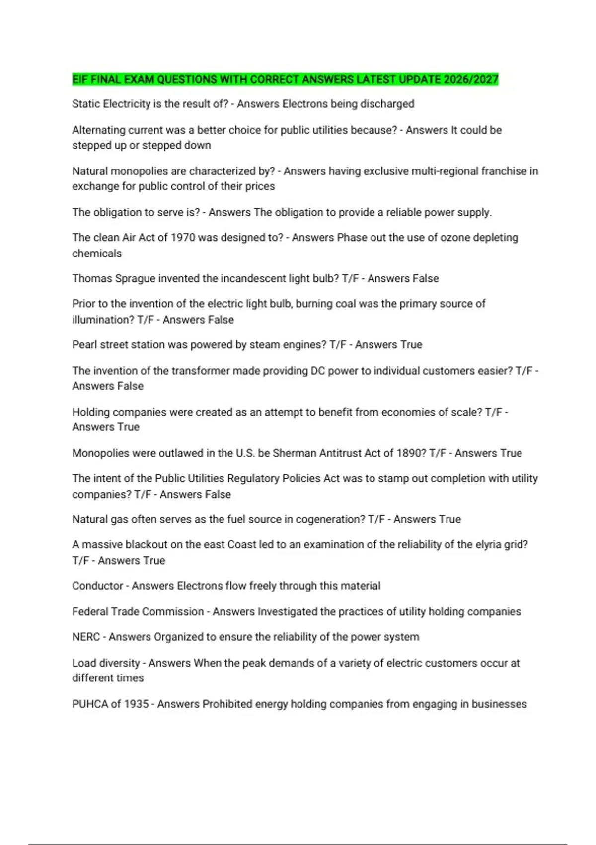 EIF EXAM QUESTIONS WITH CORRECT ANSWERS LATEST UPDATE 2026/2027