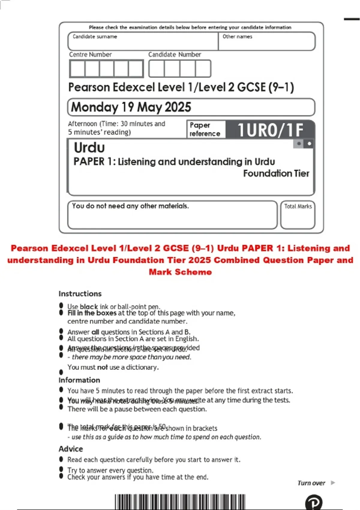 Pearson Edexcel Level 1/Level 2 GCSE (9–1) Urdu PAPER 1: Listening and understanding in Urdu Foundation Tier 2025 Combined Question Paper and Mark Scheme
