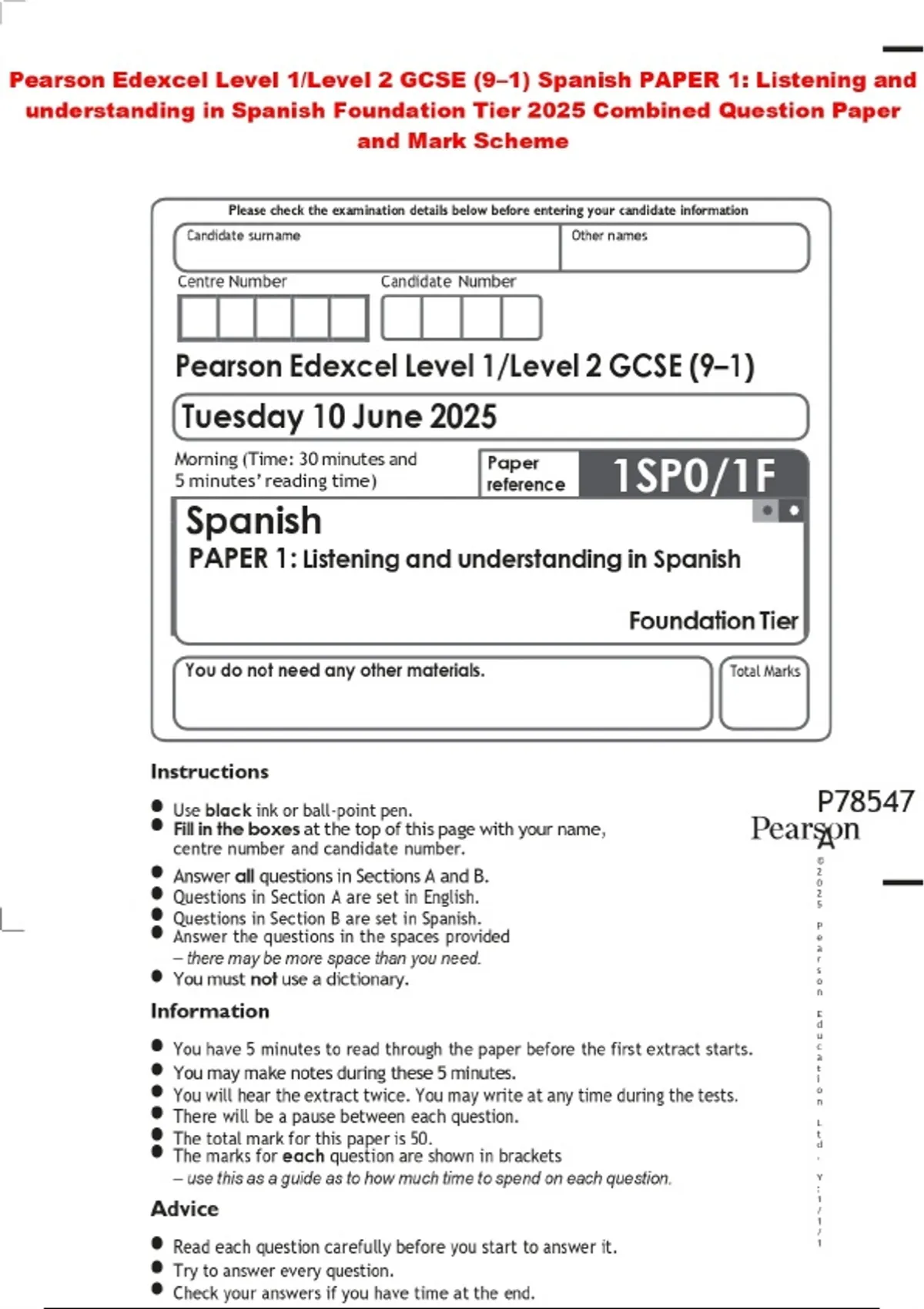 Pearson Edexcel Level 1/Level 2 GCSE (9–1) Spanish PAPER 1: Listening and understanding in Spanish Foundation Tier 2025 Combined Question Paper and Mark Scheme