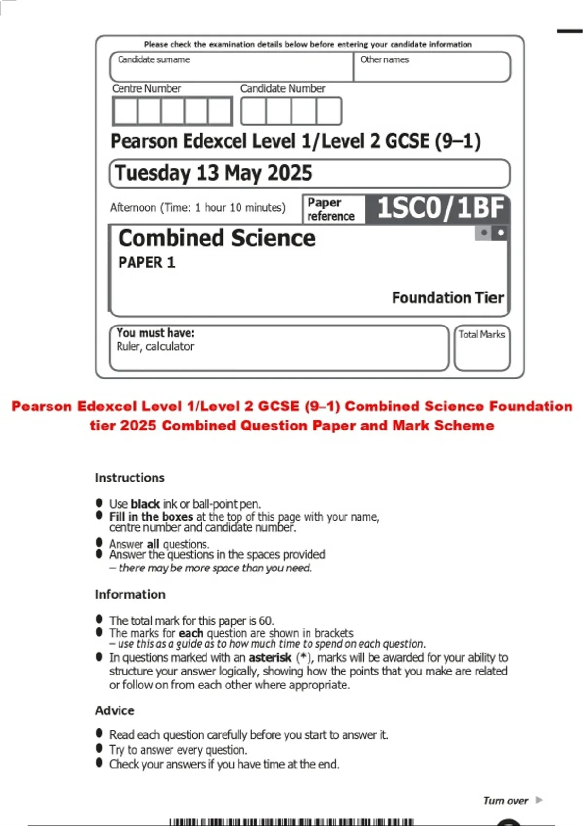 Pearson Edexcel Level 1/Level 2 GCSE (9–1) Combined Science Foundation tier 2025 Combined Question Paper and Mark Scheme