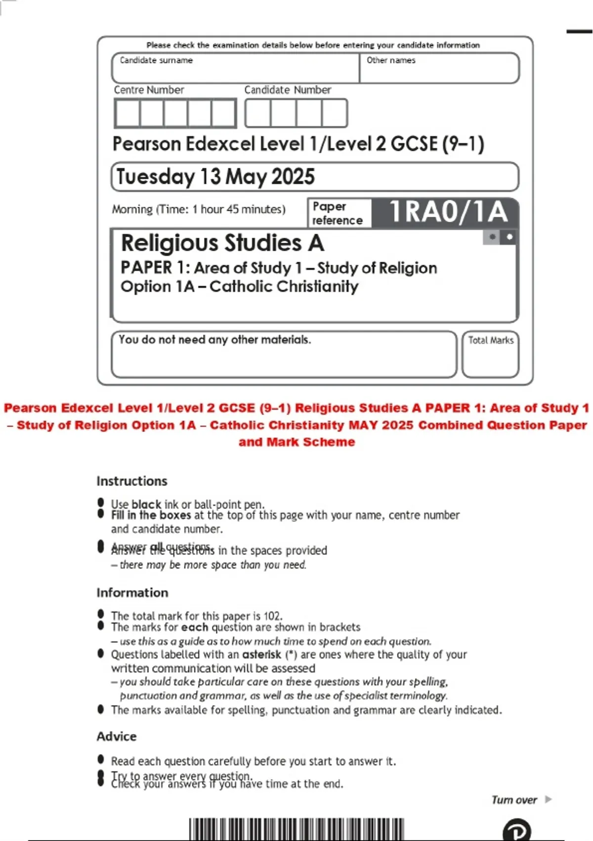 Pearson Edexcel Level 1/Level 2 GCSE (9–1) Religious Studies A PAPER 1: Area of Study 1 – Study of Religion Option 1A – Catholic Christianity MAY 2025 Combined Question Paper and Mark Scheme