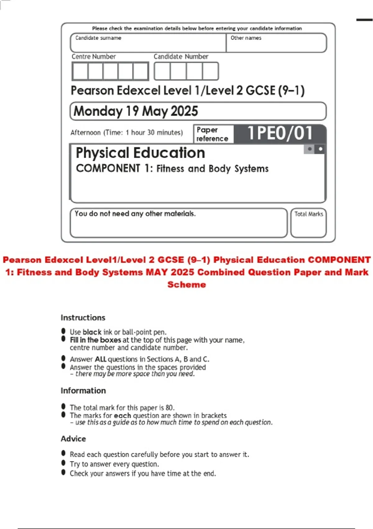 Pearson Edexcel Level1/Level 2 GCSE (9–1) Physical Education COMPONENT 1: Fitness and Body Systems MAY 2025 Combined Question Paper and Mark Scheme