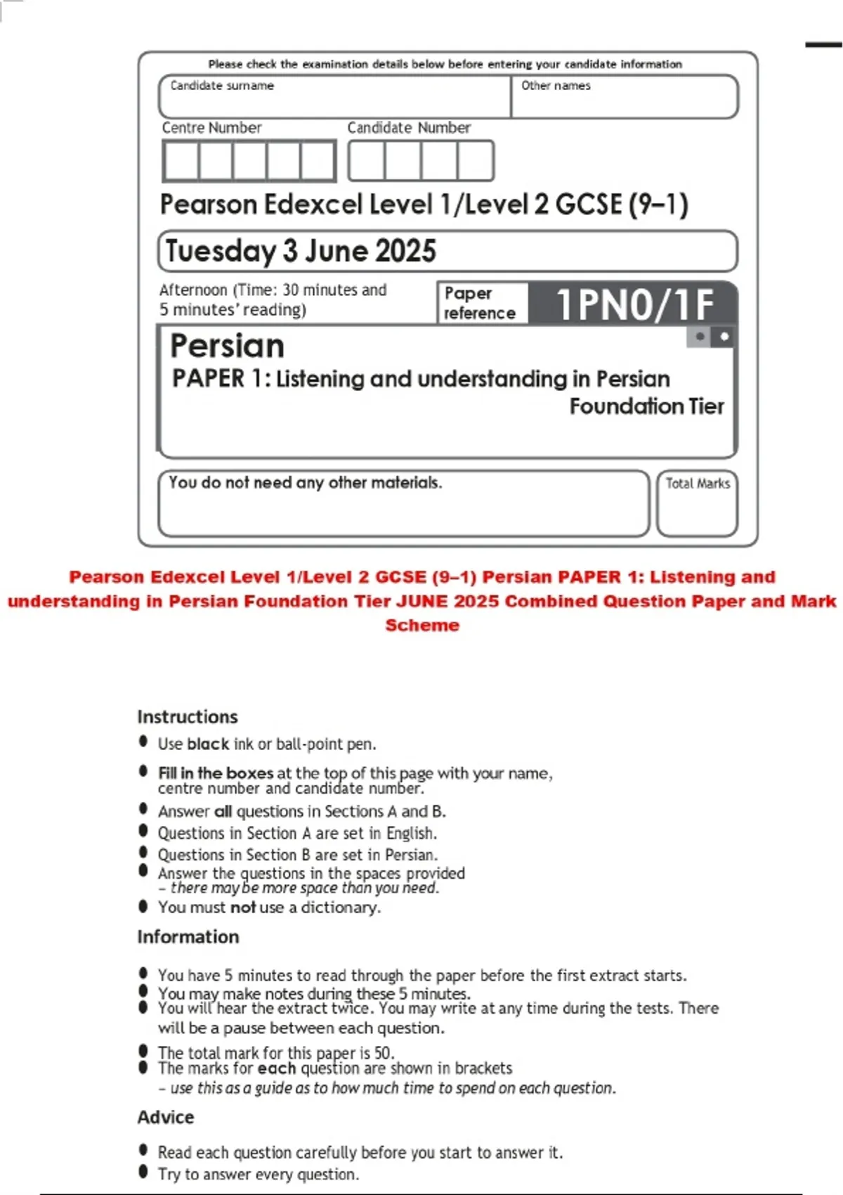 Pearson Edexcel Level 1/Level 2 GCSE (9–1) Persian PAPER 1: Listening and understanding in Persian Foundation Tier JUNE 2025 Combined Question Paper and Mark Scheme